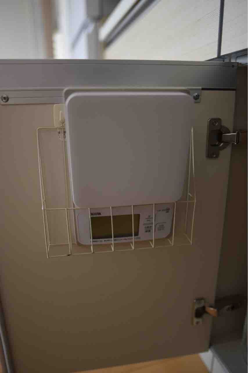 左扉には、セリアのレターラックにデジタルスケールを収めています。フックは貼って剥がせるシールを使って接着しました。