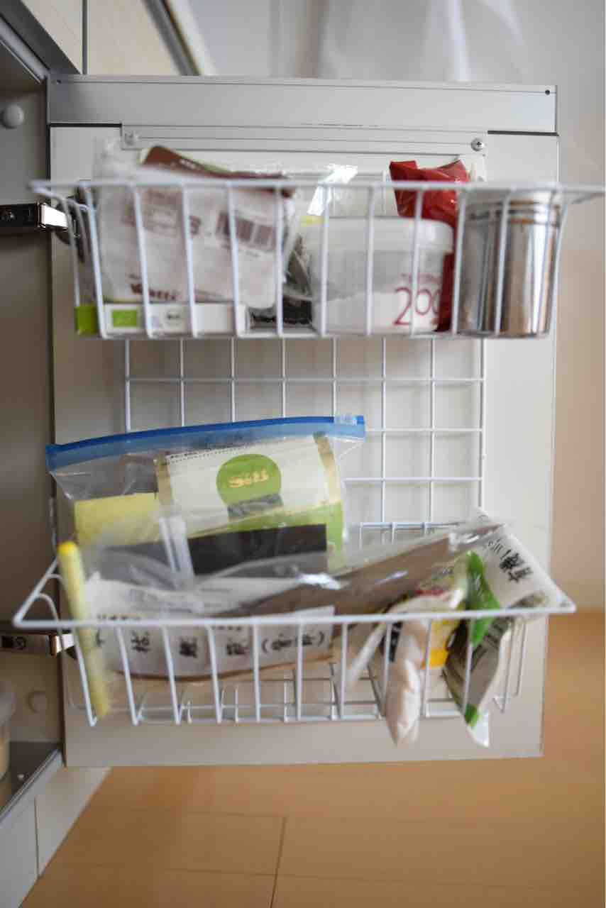 シンク下の右扉には、常温保存食材をポケットに入れています。こちらのワイヤー収納システムもセリアのものです。