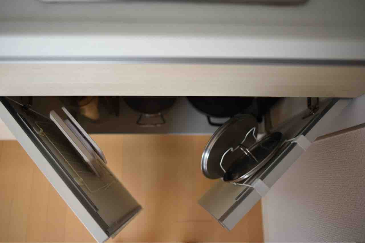 ガスコンロ下の右扉は、セリアの鍋ぶた収納ラックを掛けています。フィスラーのプロコレクションのソースパンやキャセロールのふたがサッと取れます。
