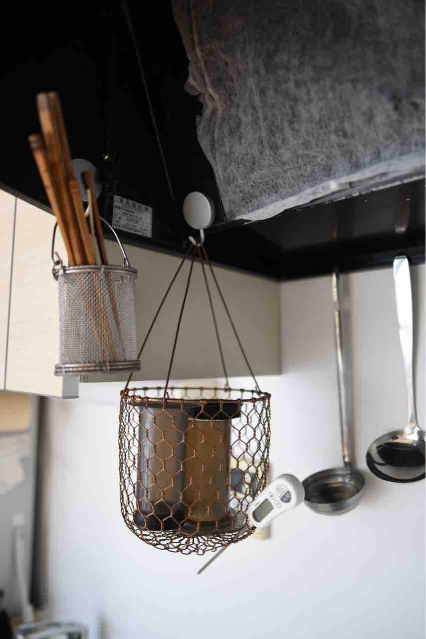 換気扇フードにも、マグネットフックを2つ付けて、釣り籠をぶら下げています。