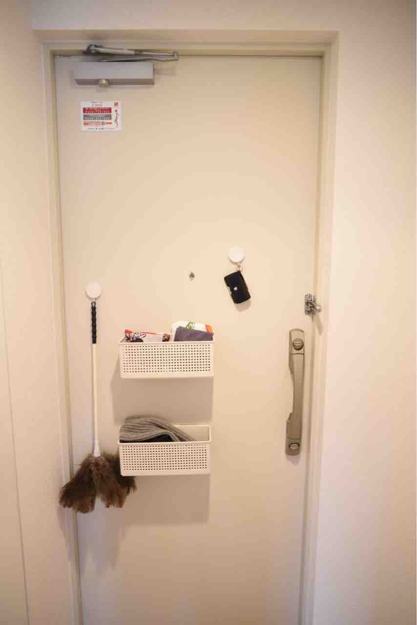 フックには、鍵・カード・小銭入れ一体型ケース、羽根ばたきを吊り下げています。