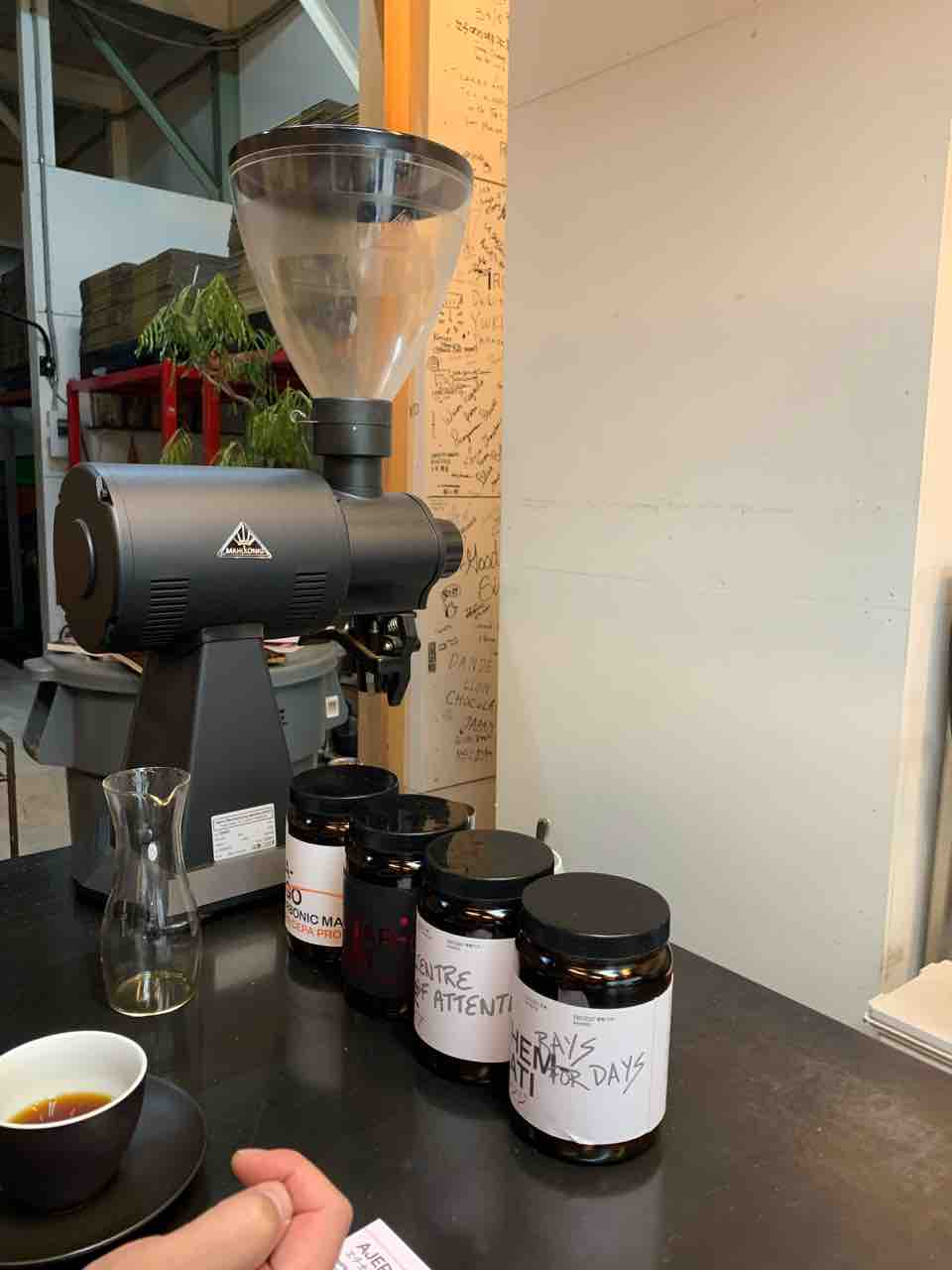 ここは、テイスティングバーで全ての豆を試飲できるのが特徴です。どれも浅煎りで、試飲すると、草、いちご、レモン などの香りの違いがはっきりと感じられ、夢中になりました。