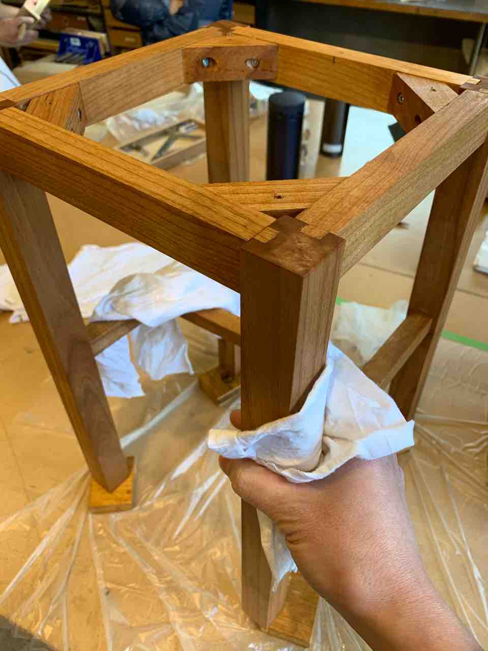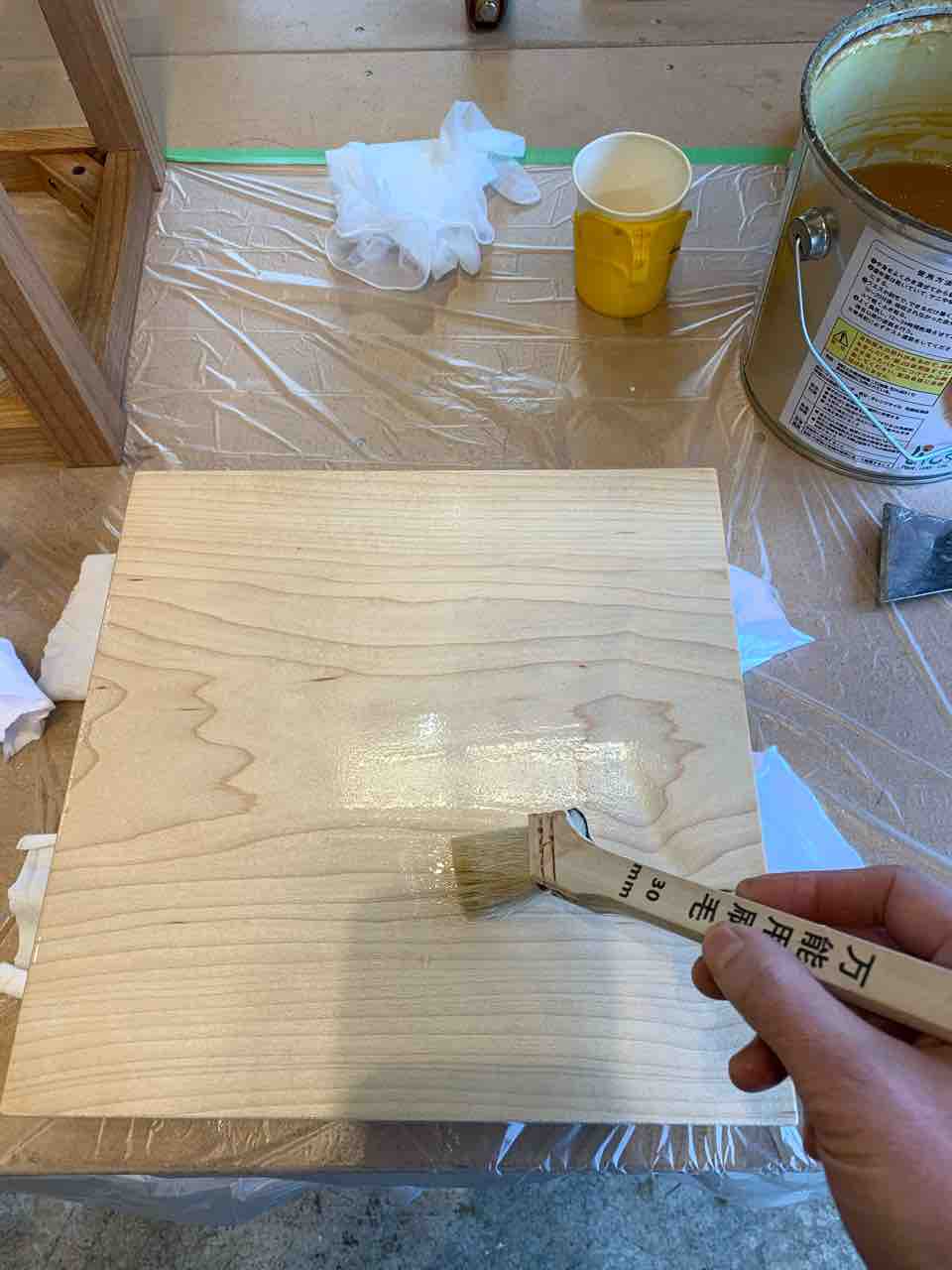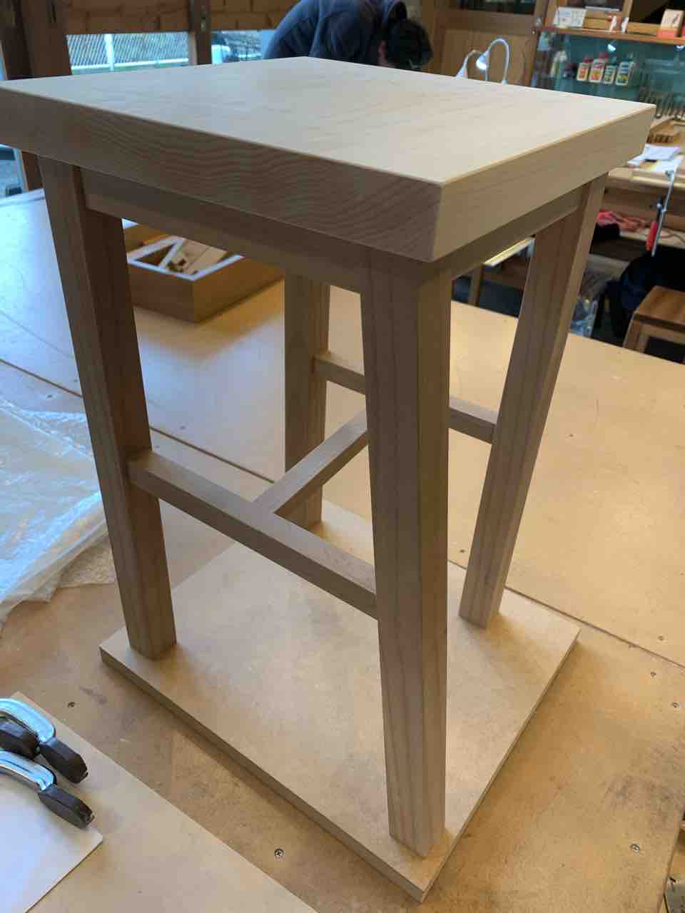 椅子作り その23 組立て・塗装 2019 12/13 木工教室 2019年12月13日 久々の木工教室です。 座面と脚を仮組みして下穴を開けてビスも打ち込み、足にぐらつきがないか確認しました。 「ippo」という名の通り、手前の脚が一歩前へ出ているのが分かりますでしょうか? 一旦バラして、はみ出したボンドを削り取ったり、小傷にアイロンを当てて消したりしました。 そして1回目のオイル塗装をしました。 15分後に拭き取りました。 表面が乾いたら、もう一度組み上げました。 組み上がったところです。次回、2回目の塗装をして完成となります。 励みになります。 応援のクリックお願いします<(_ _)> 木工教室 この記事が気に入ったら フォローしてね! Follow @citrus_bkr よかったらシェアしてね! URLをコピーしました! URLをコピーしました! 椅子作り その22 座面の仕上げ 椅子作り その24 完成編!! この記事を書いた人 kitchen_obake 関連記事 【木工教室 最終回】白書き(しらがき)と毛引き(けひき)の仕込み 2021年8月30日 小抽き出し その27 塗装(2回目), 持ち手の取付け 2021年8月29日 小抽き出し その26 台輪の取付け、塗装(1回目) 2021年8月26日 小抽き出し その25 抽き出しのはめ合い調整 2021年8月19日 小抽き出し その24 天板の取付けと台輪 2021年7月23日 小抽き出し その23 背板の接ぎ合わせ 2021年6月24日 小抽き出し その22 天板の接ぎ合わせ 2021年6月11日 小抽き出し その21 摺り桟の取り付け 2021年6月10日 コメント コメントする コメントをキャンセルコメント ※ 名前 ※ メール ※ サイト 次回のコメントで使用するためブラウザーに自分の名前、メールアドレス、サイトを保存する。