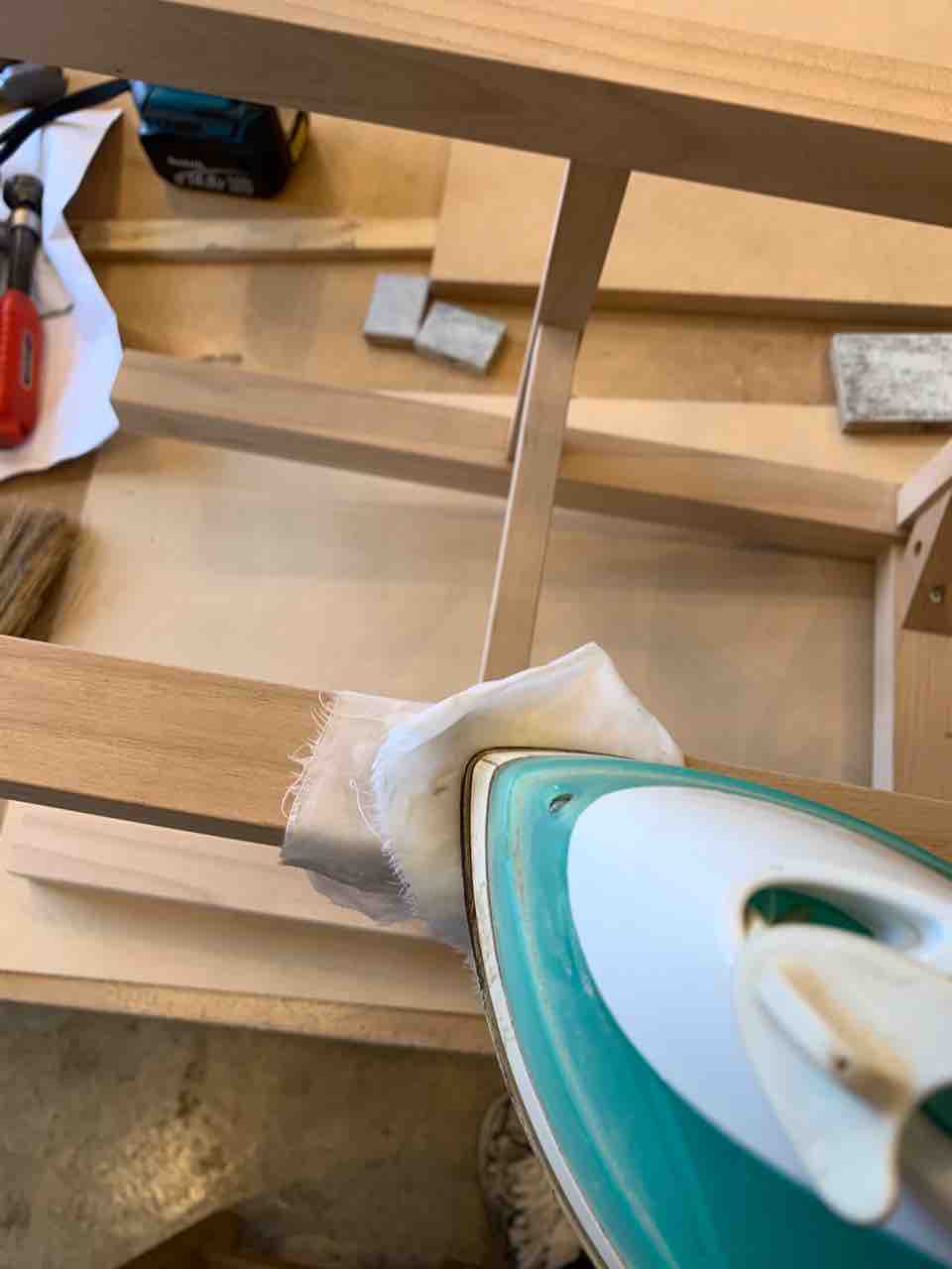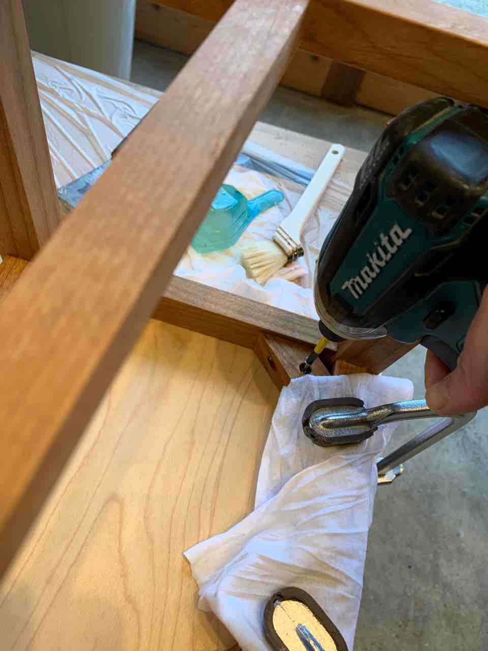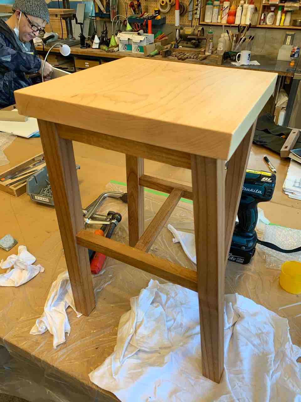 椅子作り その23 組立て・塗装 2019 12/13 木工教室 2019年12月13日 久々の木工教室です。 座面と脚を仮組みして下穴を開けてビスも打ち込み、足にぐらつきがないか確認しました。 「ippo」という名の通り、手前の脚が一歩前へ出ているのが分かりますでしょうか? 一旦バラして、はみ出したボンドを削り取ったり、小傷にアイロンを当てて消したりしました。 そして1回目のオイル塗装をしました。 15分後に拭き取りました。 表面が乾いたら、もう一度組み上げました。 組み上がったところです。次回、2回目の塗装をして完成となります。 励みになります。 応援のクリックお願いします<(_ _)> 木工教室 この記事が気に入ったら フォローしてね! Follow @citrus_bkr よかったらシェアしてね! URLをコピーしました! URLをコピーしました! 椅子作り その22 座面の仕上げ 椅子作り その24 完成編!! この記事を書いた人 kitchen_obake 関連記事 【木工教室 最終回】白書き(しらがき)と毛引き(けひき)の仕込み 2021年8月30日 小抽き出し その27 塗装(2回目), 持ち手の取付け 2021年8月29日 小抽き出し その26 台輪の取付け、塗装(1回目) 2021年8月26日 小抽き出し その25 抽き出しのはめ合い調整 2021年8月19日 小抽き出し その24 天板の取付けと台輪 2021年7月23日 小抽き出し その23 背板の接ぎ合わせ 2021年6月24日 小抽き出し その22 天板の接ぎ合わせ 2021年6月11日 小抽き出し その21 摺り桟の取り付け 2021年6月10日 コメント コメントする コメントをキャンセルコメント ※ 名前 ※ メール ※ サイト 次回のコメントで使用するためブラウザーに自分の名前、メールアドレス、サイトを保存する。
