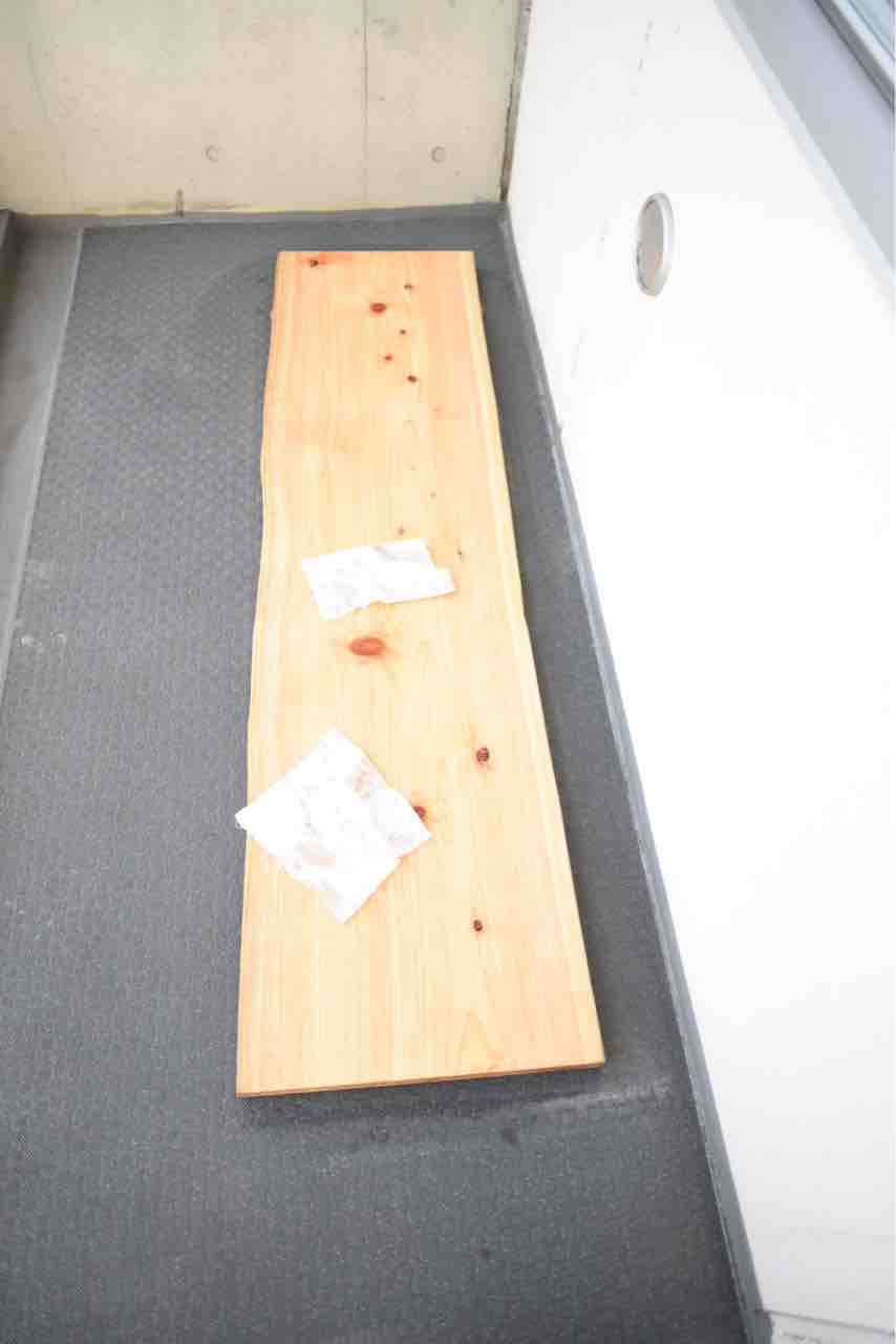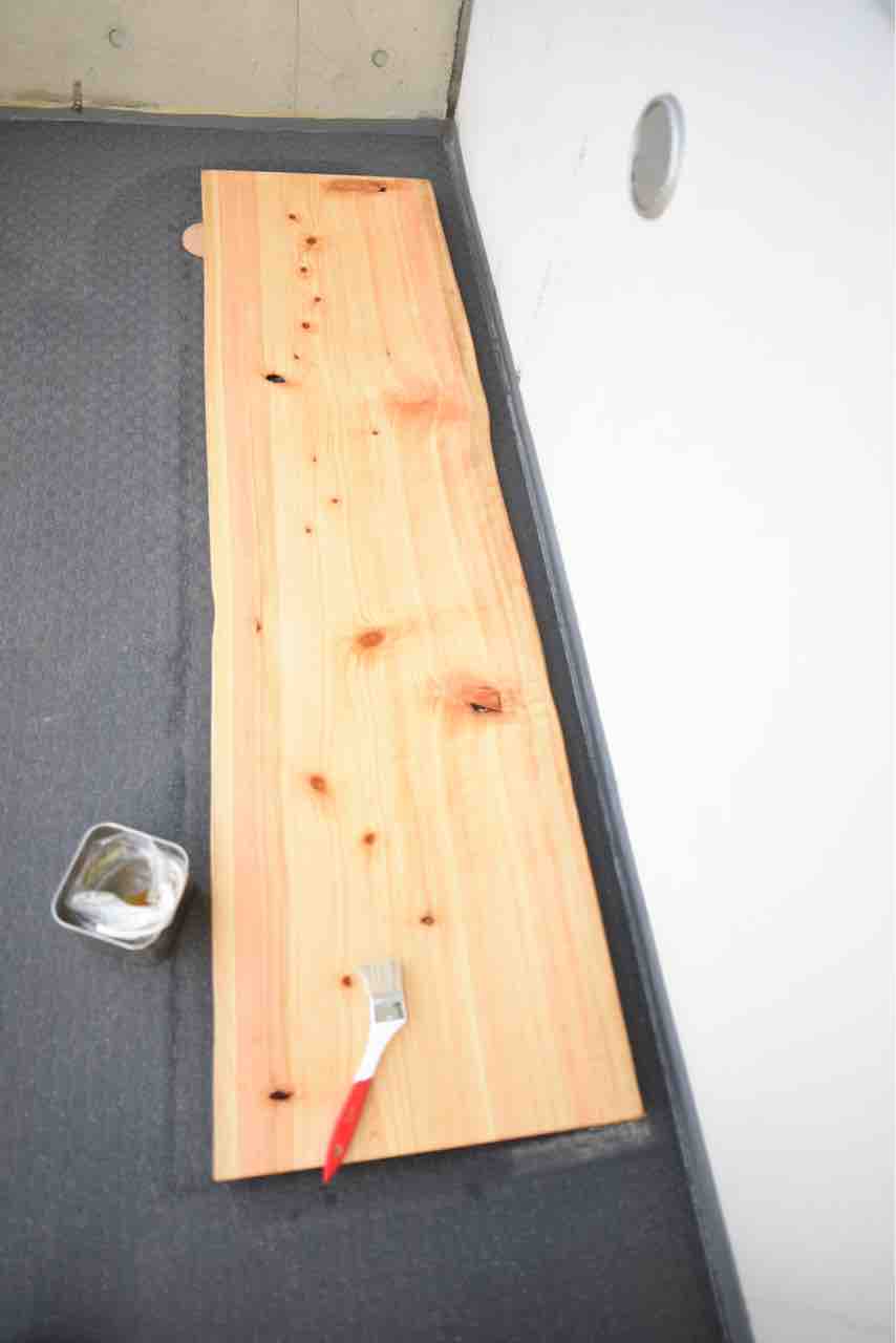 檜無垢材のオイル塗装はまず、180番のサンドペーパーをかけ、水拭きしてから、240番のペーパーですべすべにしました。