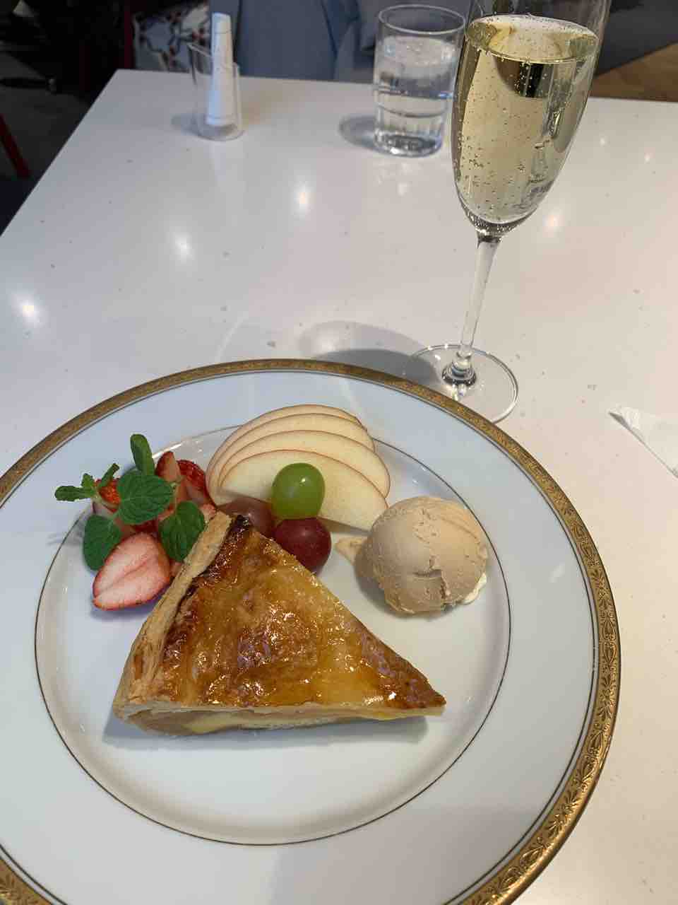 デパートものぞき、疲れたのでパーラーでデザート盛りとスパークリングワインのセットを頼みました。