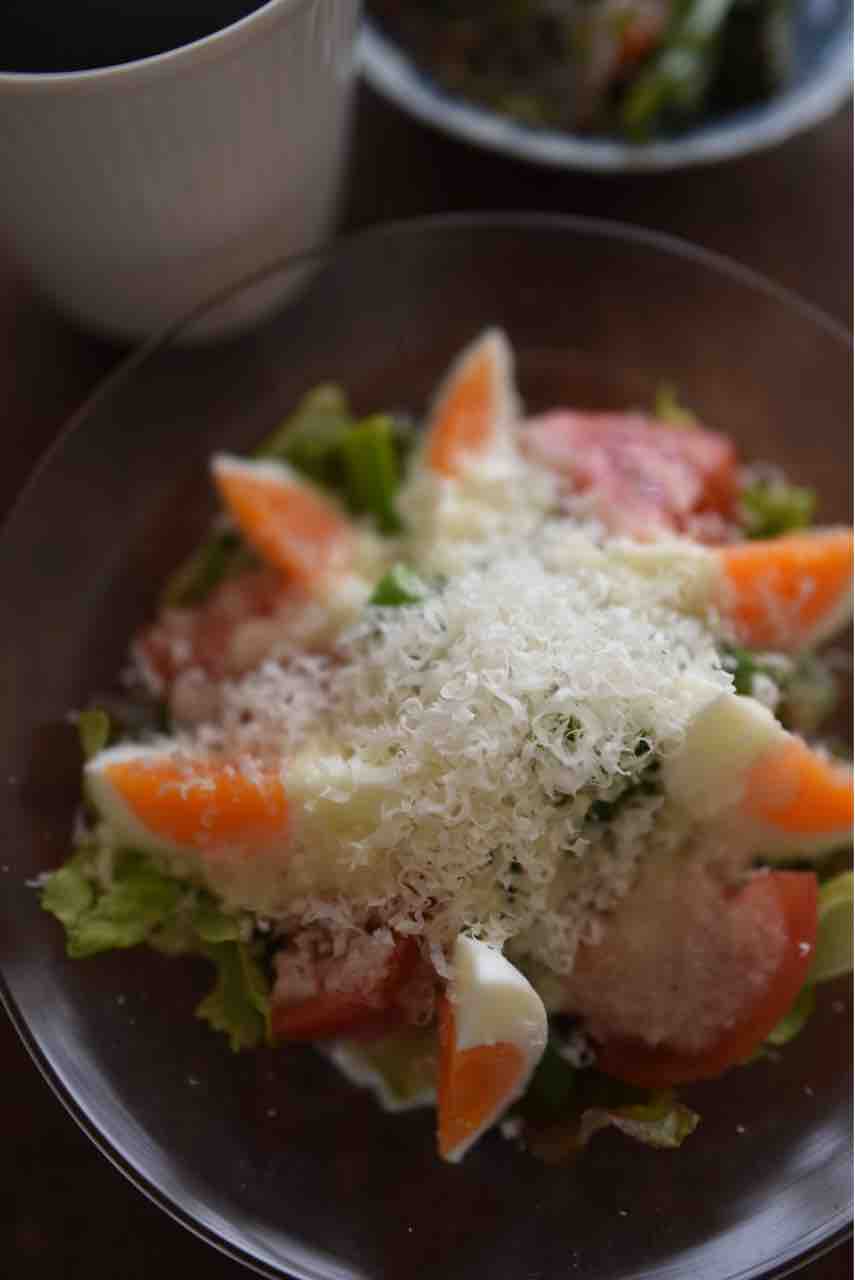 ゆで卵、サニーレタス、スティックセニョール、いんげん、トマト、パルミジャーノ・レッジャーノ でサラダも作りました。