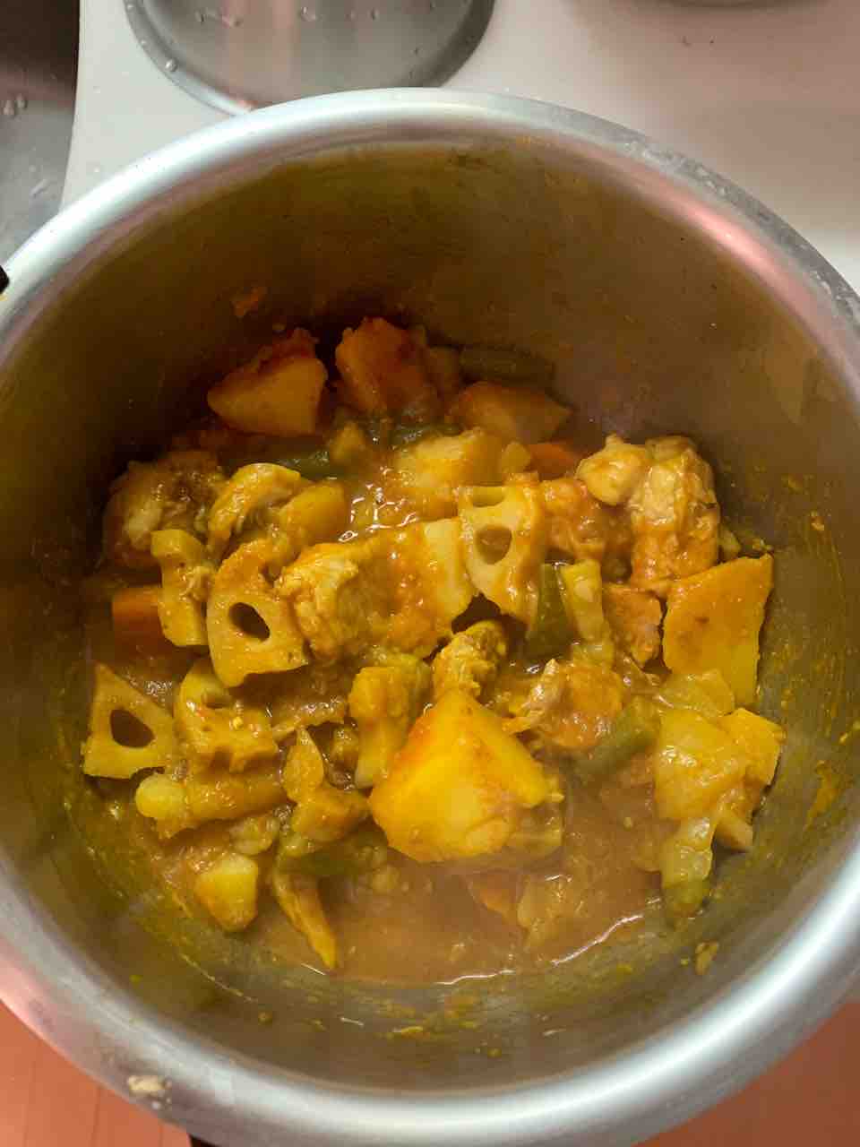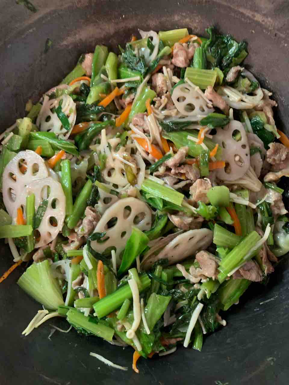 豚肉、小松菜、れんこん、にら、にんじん、えのきだけ、キャベツ で肉野菜炒めを作りました。これは息子が包丁して炒めました。