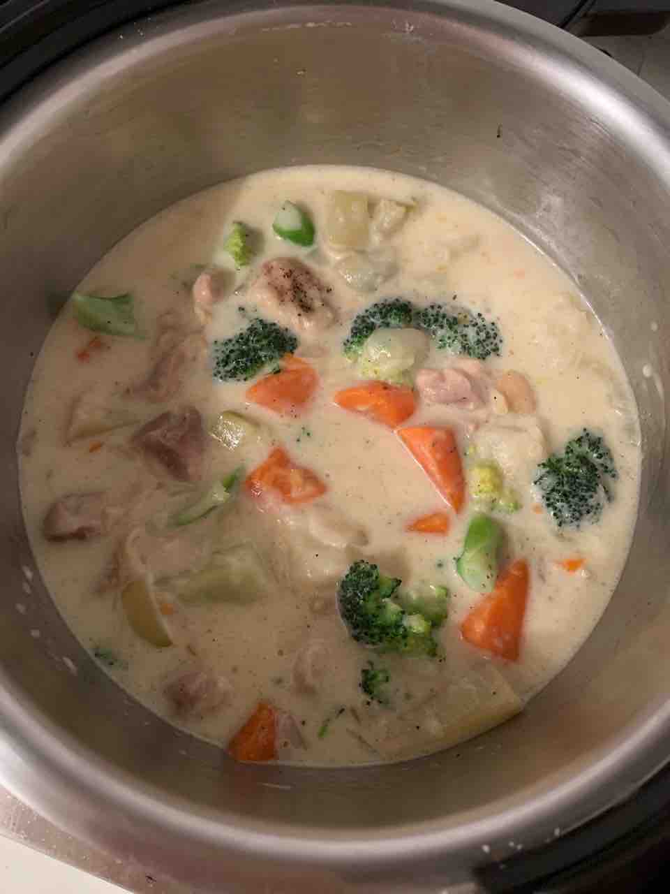鶏もも肉、玉ねぎ、人参、じゃがいも、ブロッコリー でチキンフリカッセを作りました。
