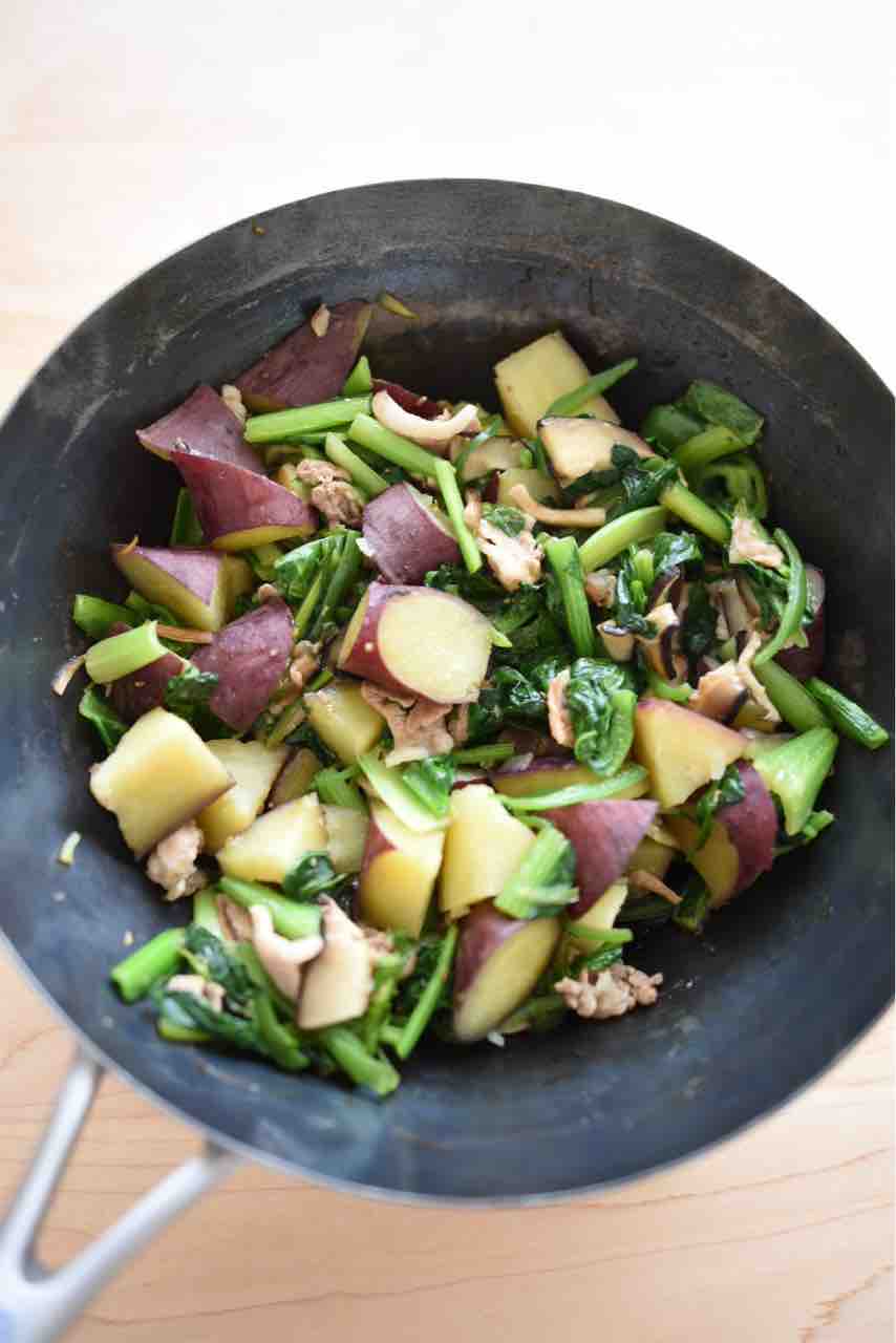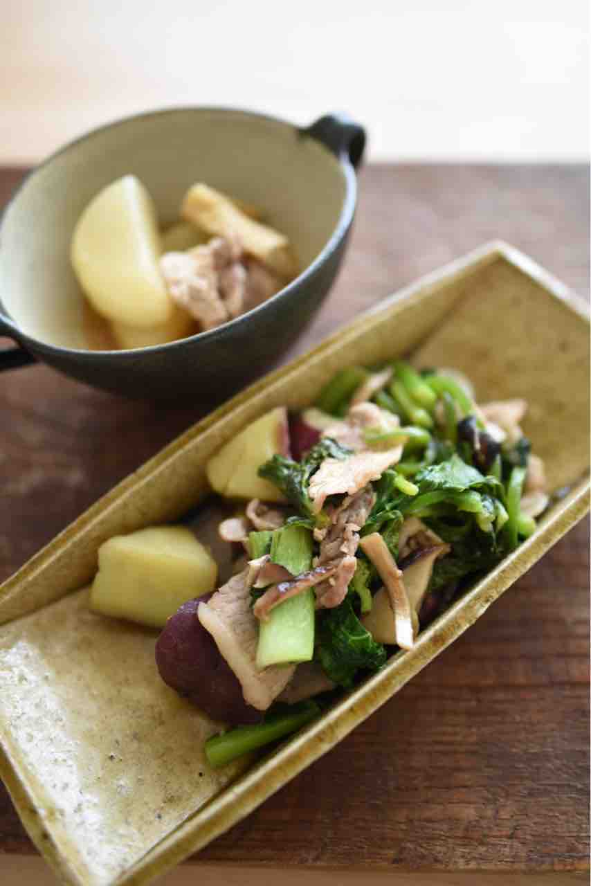 小松菜、菜花、椎茸、ピーマン、さつまいも、豚肉 で肉野菜炒めも作りました。