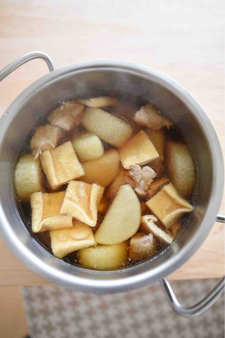 大根、鶏肉、油揚げ で炊き合わせも作りました。出汁はこだわって、羅臼昆布、かつお本枯節、まぐろ削り節 の混合で取りました。