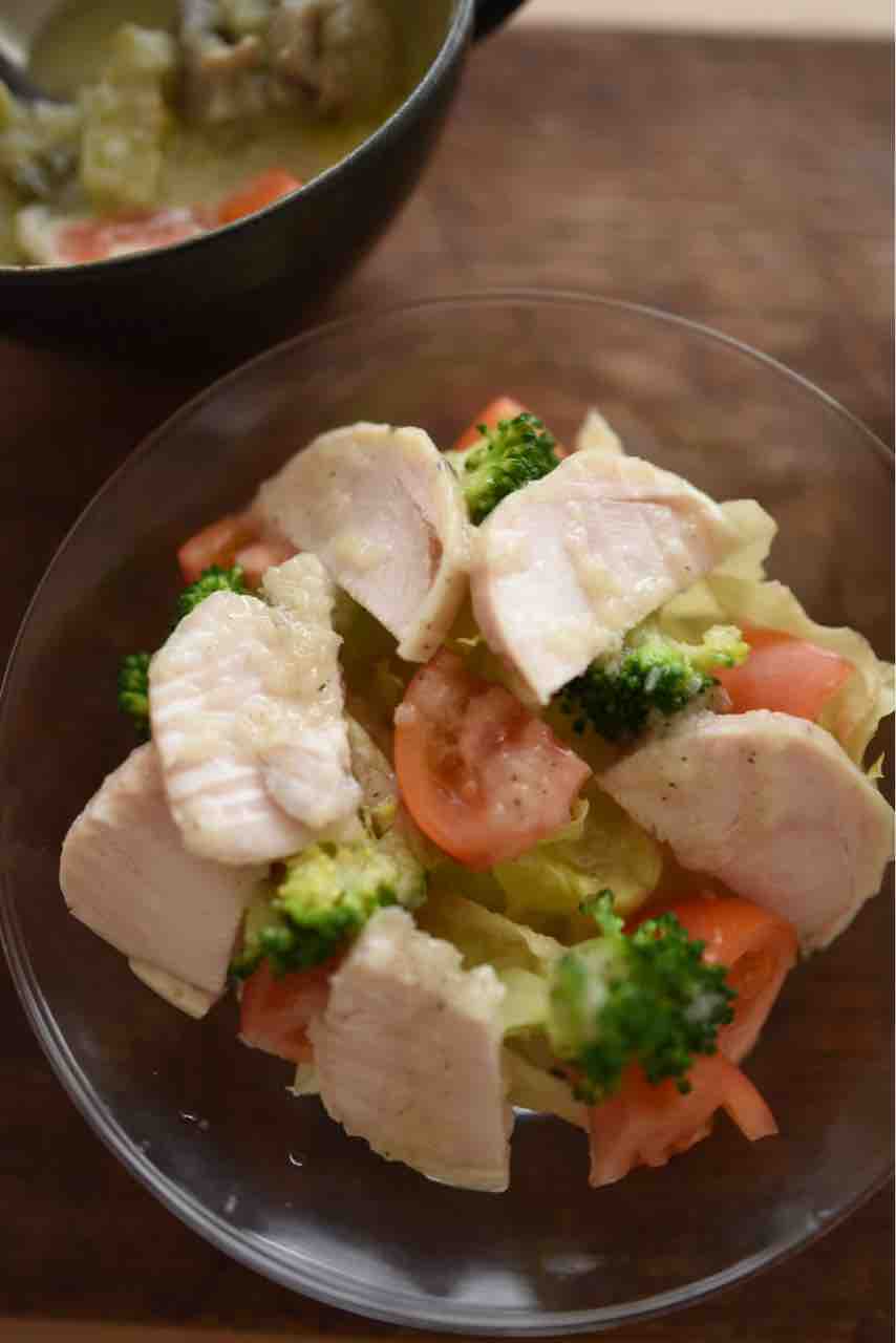 ANOVA Precision Cookerで低温調理した鶏ハムと、レタス、ブロッコリー、トマト でサラダも作りました。