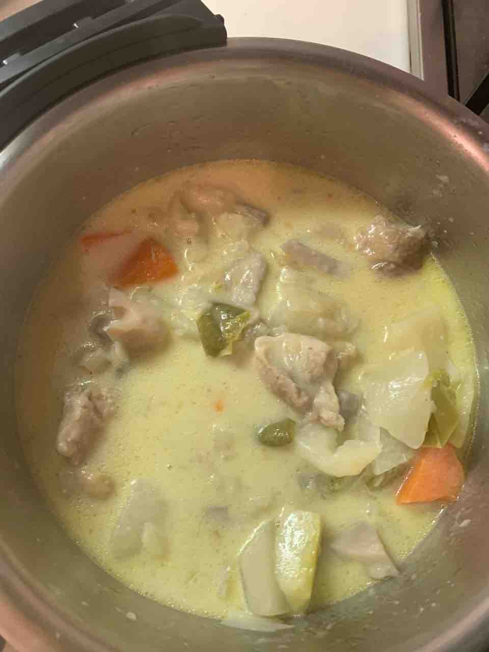 鶏もも肉、大根、かぶ、ブロッコリー、ピーマン、玉ねぎ、にんじん、じゃがいも でチキンフリカッセを作りました。息子がホワイトソース作りからの仕上げをしました。