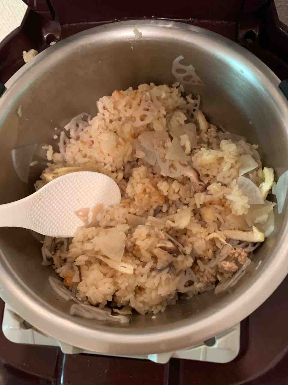 大根、蓮根、椎茸、人参、鶏挽肉、油揚げ で炊き込みご飯も作りました。包丁は息子がしました。ウチには炊飯器がありません。電気IH圧力なべで炊きました。この鍋は1台で本当に生産性が高いです。