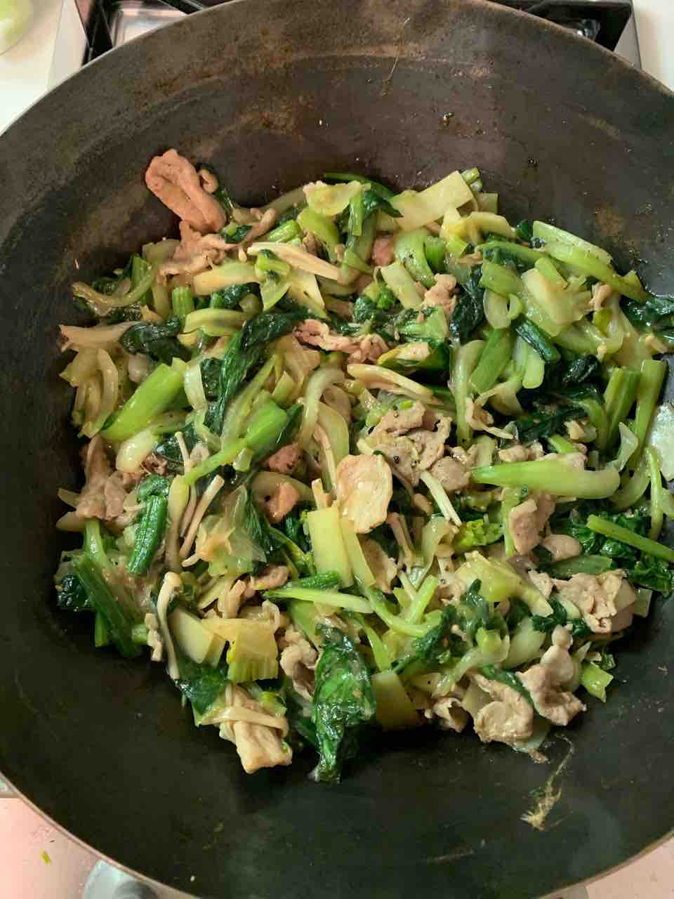 豚肉、大根の葉、小松菜、チンゲン菜、えのきだけ で肉野菜炒めも作りました。