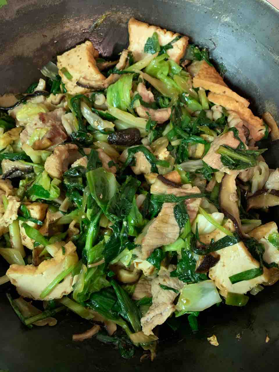 豚肉、厚揚げ、キャベツ、椎茸、葉ねぎ、のらぼう菜、ニラ で肉野菜炒めも作りました。