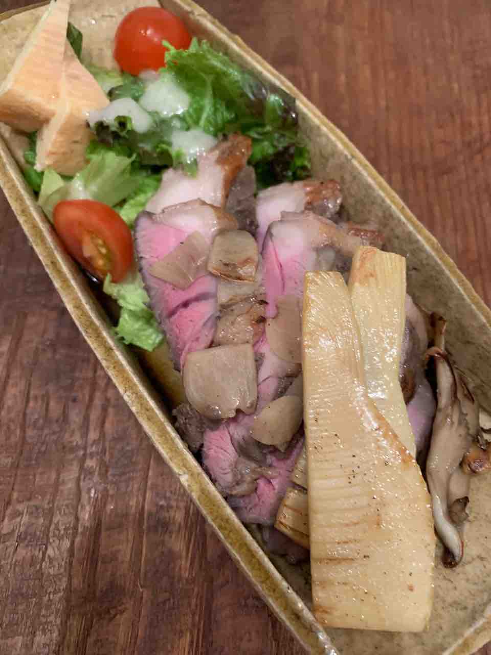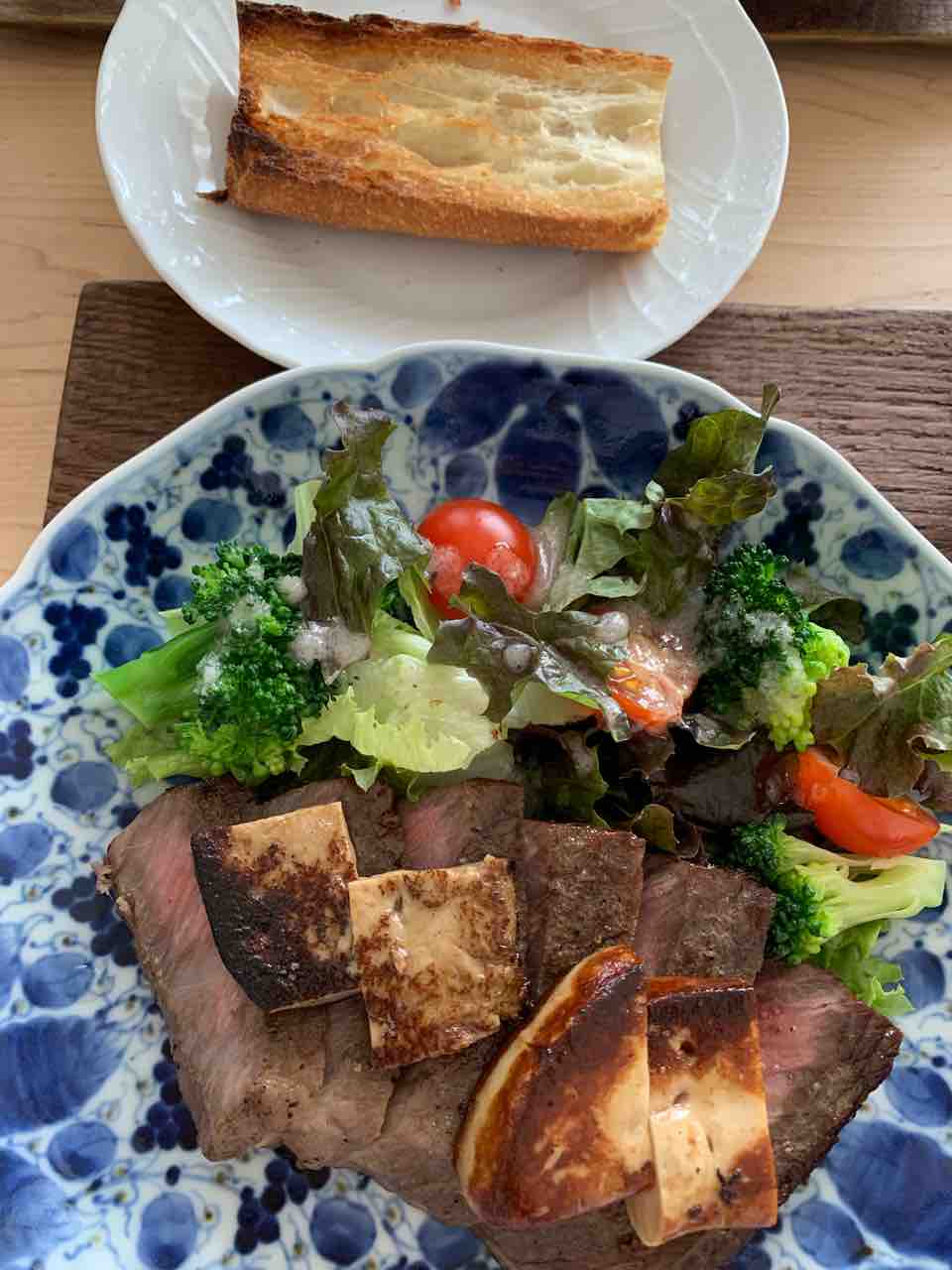 黒毛和牛A5ももブロックが大きかったので、ステーキ用に切り分けて、それも真空低温調理し、表面だけサッと焼き付けてステーキも作りました。