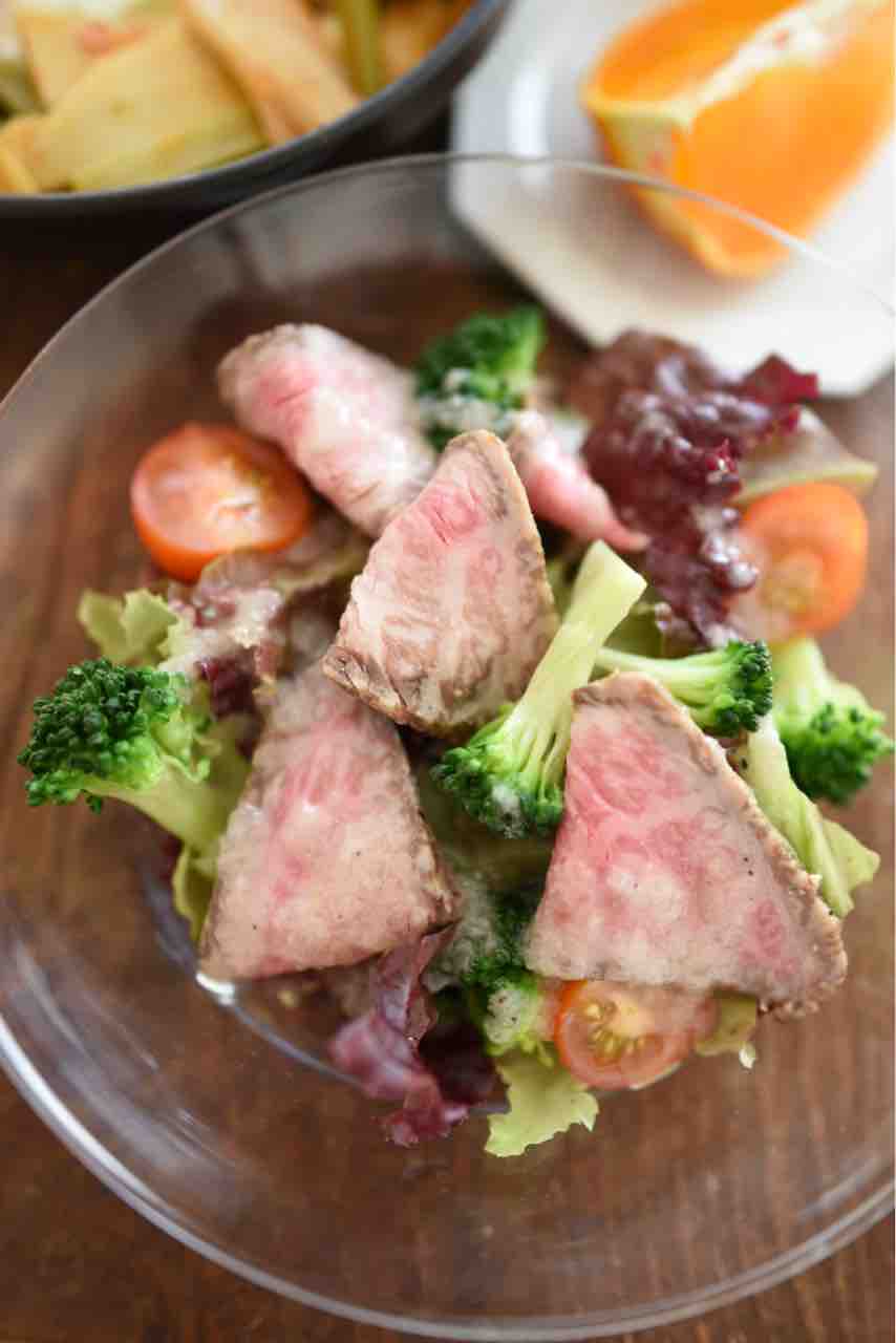 そのローストビーフ、リーフレタス、ブロッコリー、トマト でサラダを作りました。