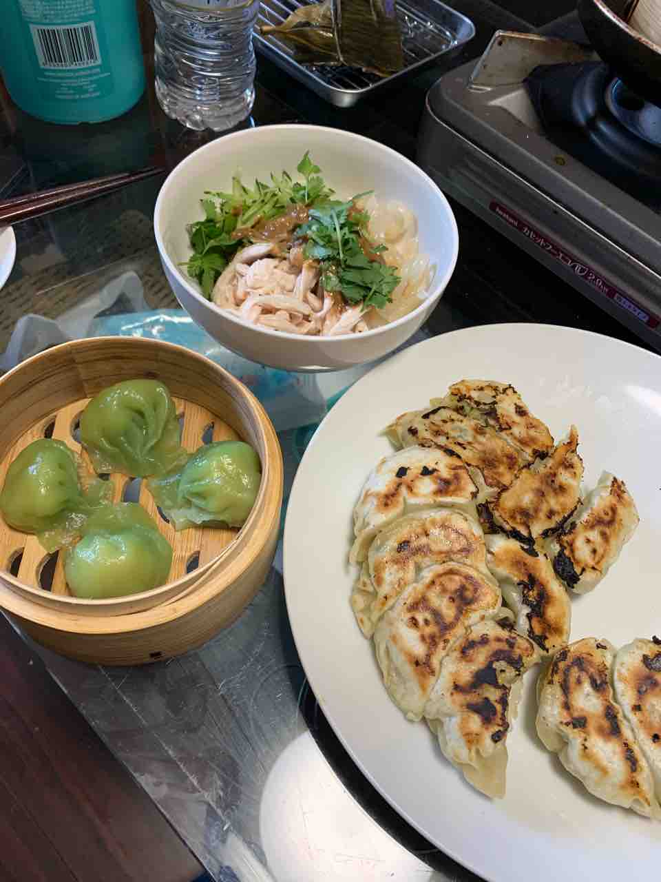 皮から作った自慢の餃子、棒々鶏&くらげ&パクチー、中華街で買ってきた翡翠餃子。鶏肉は低温調理でしっとりと仕上げました。