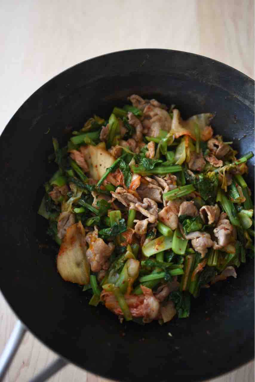 そして最後に、小松菜、宮内菜、長葱、豚肉 でキムチ炒めも作りました。仕上げに花椒をたっぷり挽き入れました。