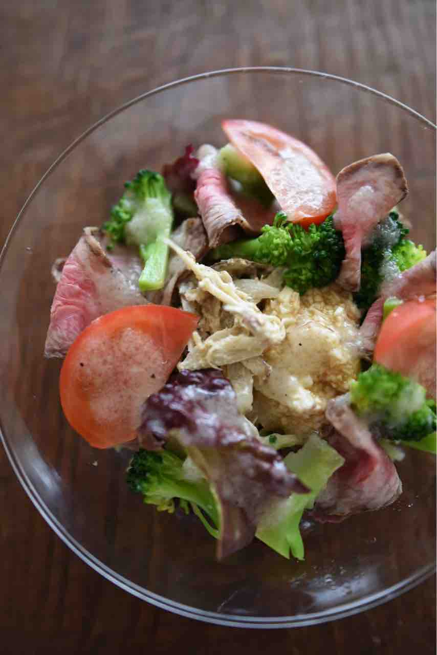 そのごぼうサラダと、トマト、サニーレタス、スナップえんどう、ブロッコリー、叩き長芋、ローストビーフでこれ以上ないってくらいてんこ盛りのサラダも作りました。自家製玉ねぎドレッシングをたっぷりかけて食べました。