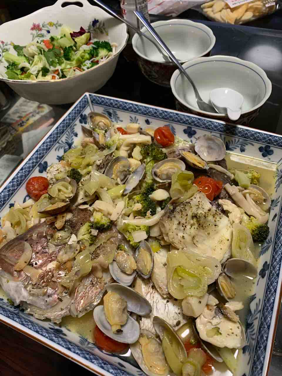 またある日は、いろいろ野菜サラダ、鯛のアクアパッツァもごちそうになりました。