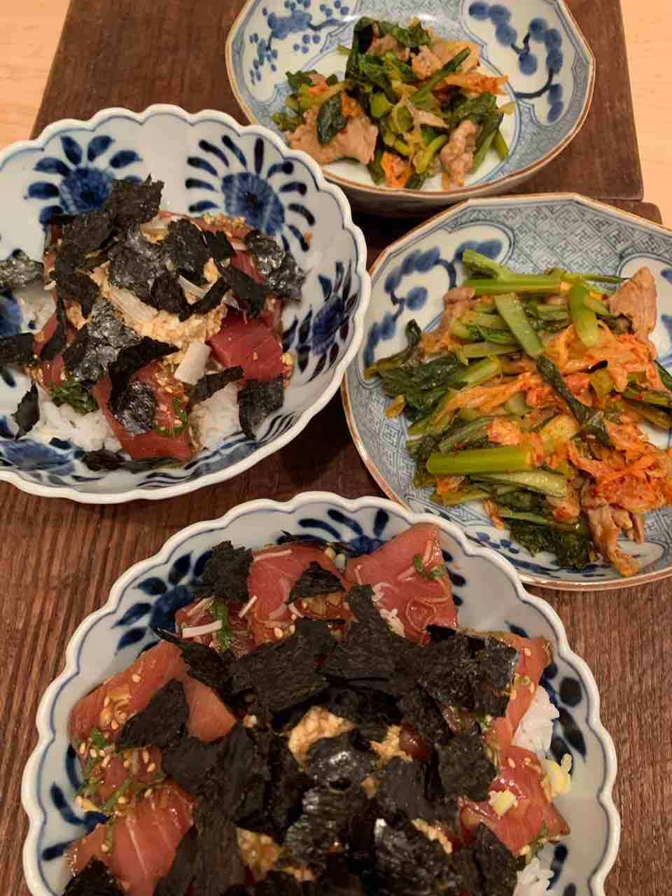 インドマグロの良いものが手に入ったので、マグロ山かけ丼も作りました。大葉、長葱、長芋、胡麻、海苔などをあしらいました。