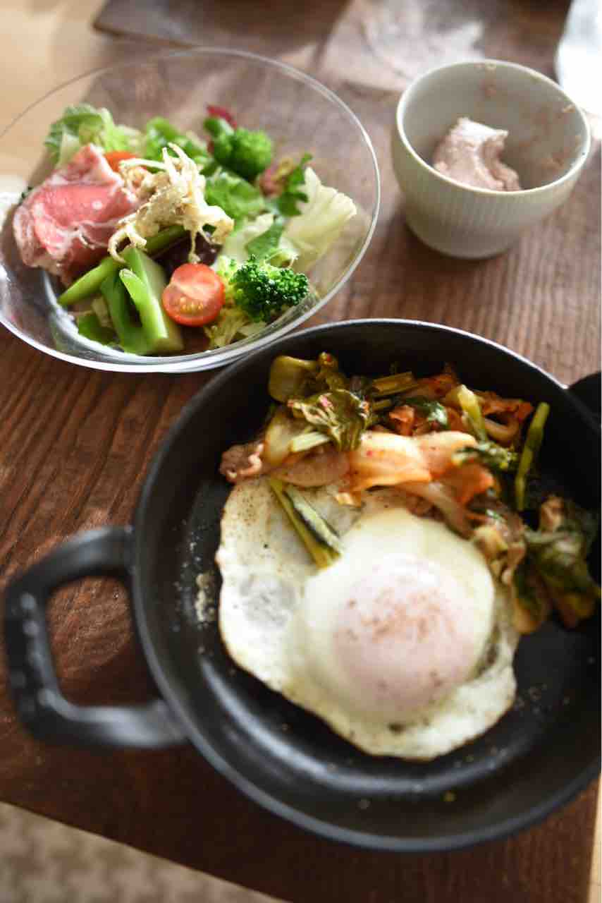 朝食は、シンプルな目玉焼きの脇に適当に作りおきの野菜炒めなどものっけてしまいます。お腹いっぱいになります。