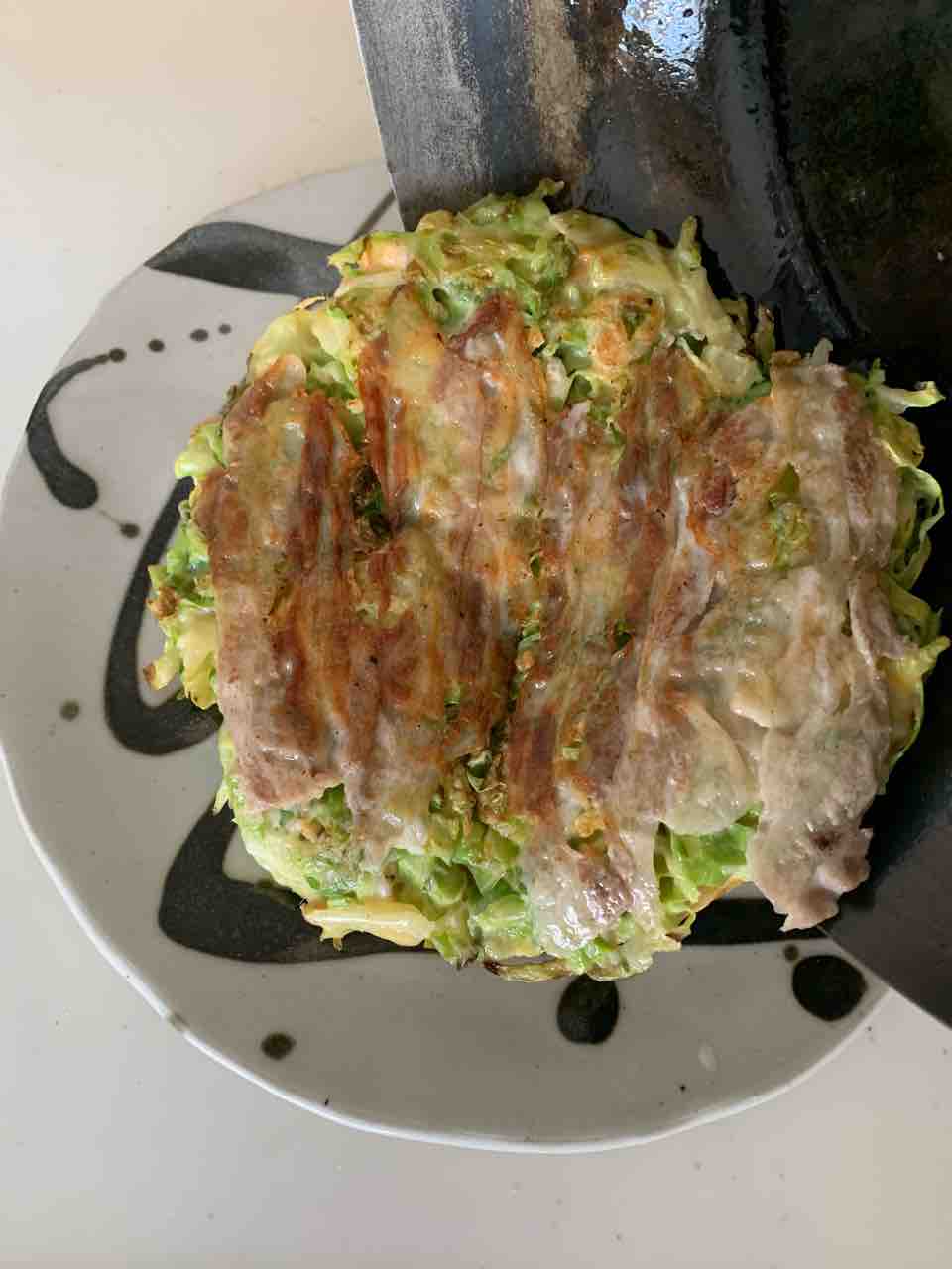 豚肉、桜海老、キャベツ、粉、卵 でお好み焼きも作りました。ビタクラフトと山田工業所とがコラボした鉄のフライパン、全くくっつかず絶好調です。