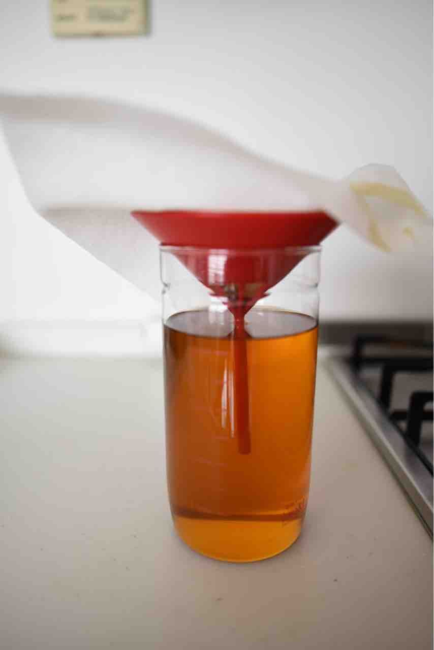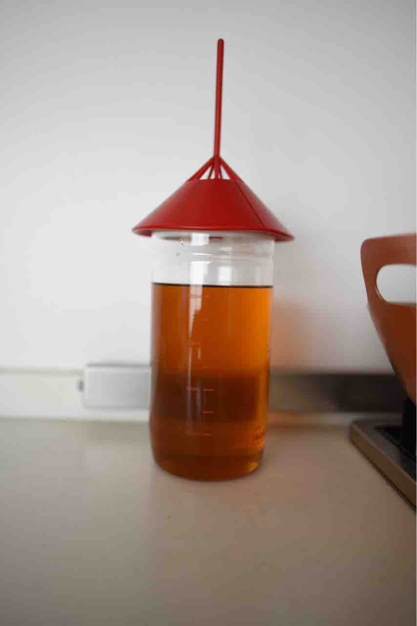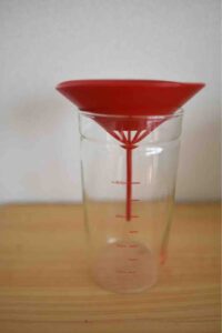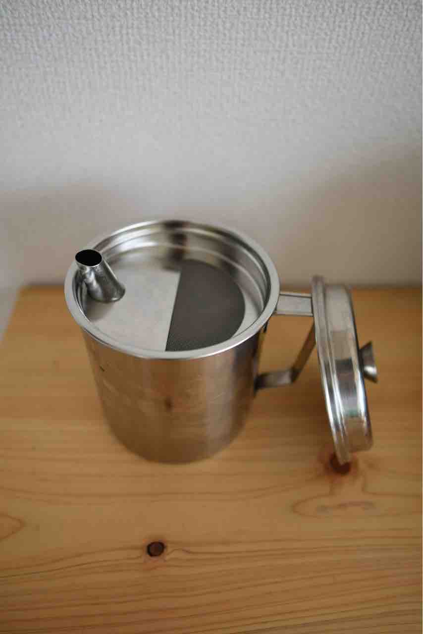 この方式だと、揚げ物をするときに、ガラス瓶からゴムべらなどを使って油をすべて鍋に移し入れれば、ガラス瓶を毎回きれいに洗うことができます。