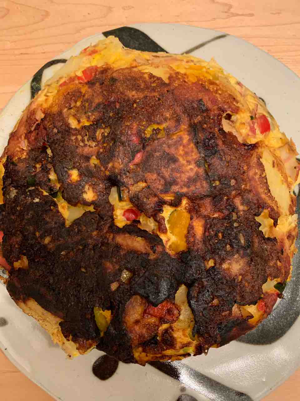 ベーコン、卵、じゃがいも、南瓜、玉ねぎ、人参、赤ピーマン でスペイン風オムレツも作りました。焼き色が豪快な感じになりました 笑。