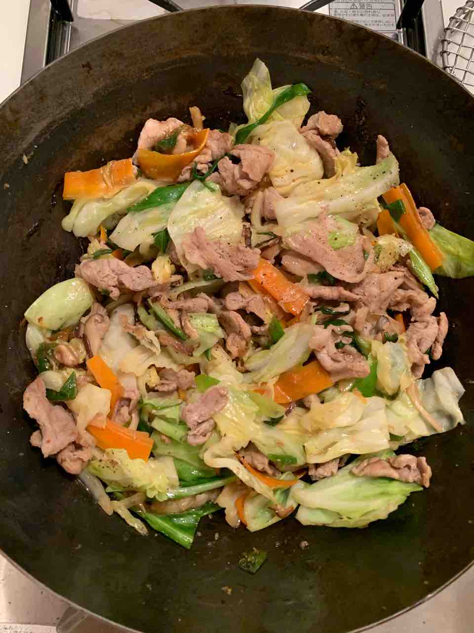 最後に、豚肉、キャベツ、人参、葉葱、椎茸 で肉野菜炒めも作りました。