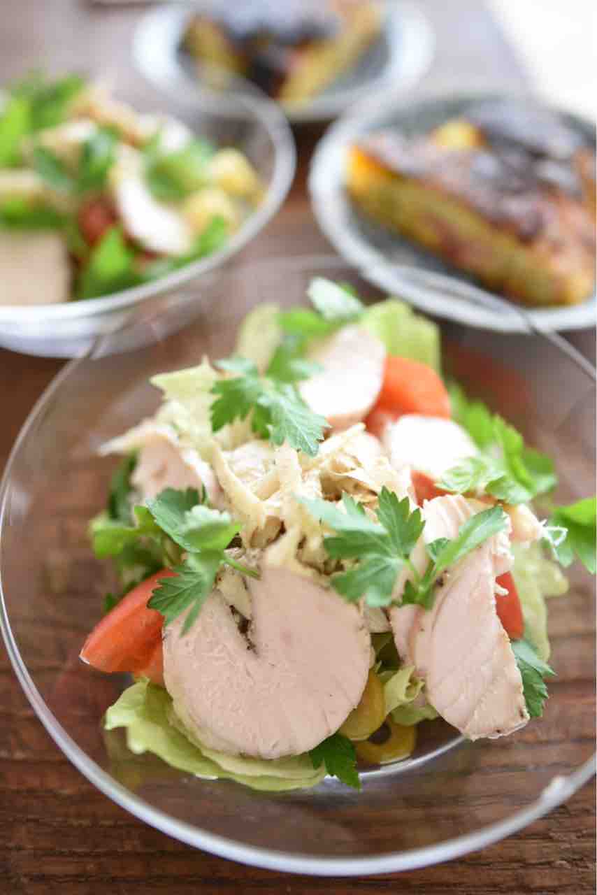 鶏胸肉を真空低温調理して鶏ハムを作り、レタス、トマト、イタリアンパセリ とともにサラダにしました。