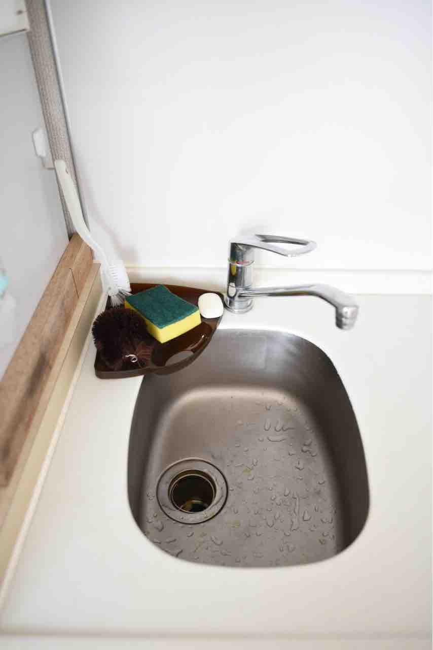 新しいスポンジラックは、シンク左奥のデッドスペースにピッタリはまる形で、スポンジ、たわし、石けんが平置きできます。