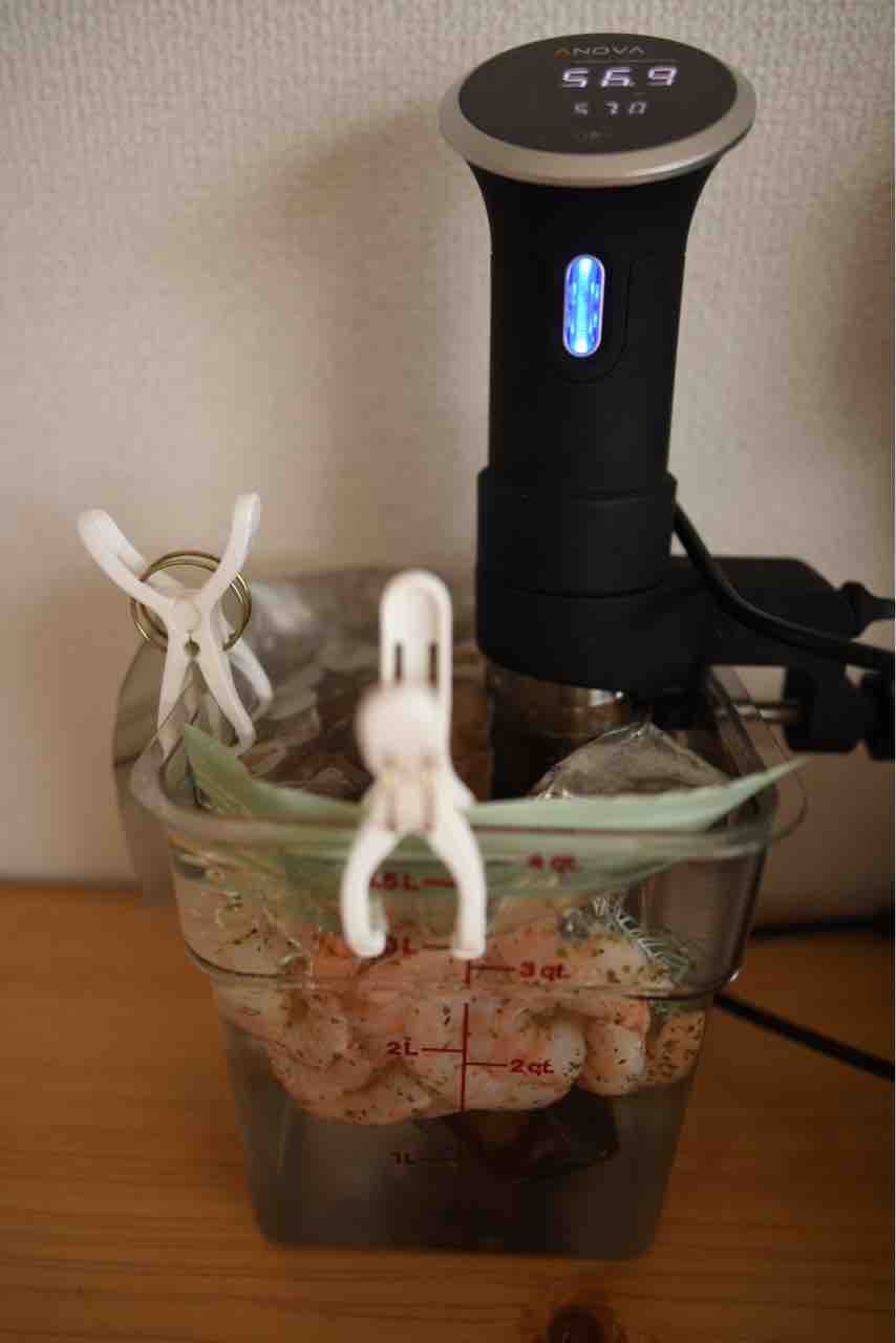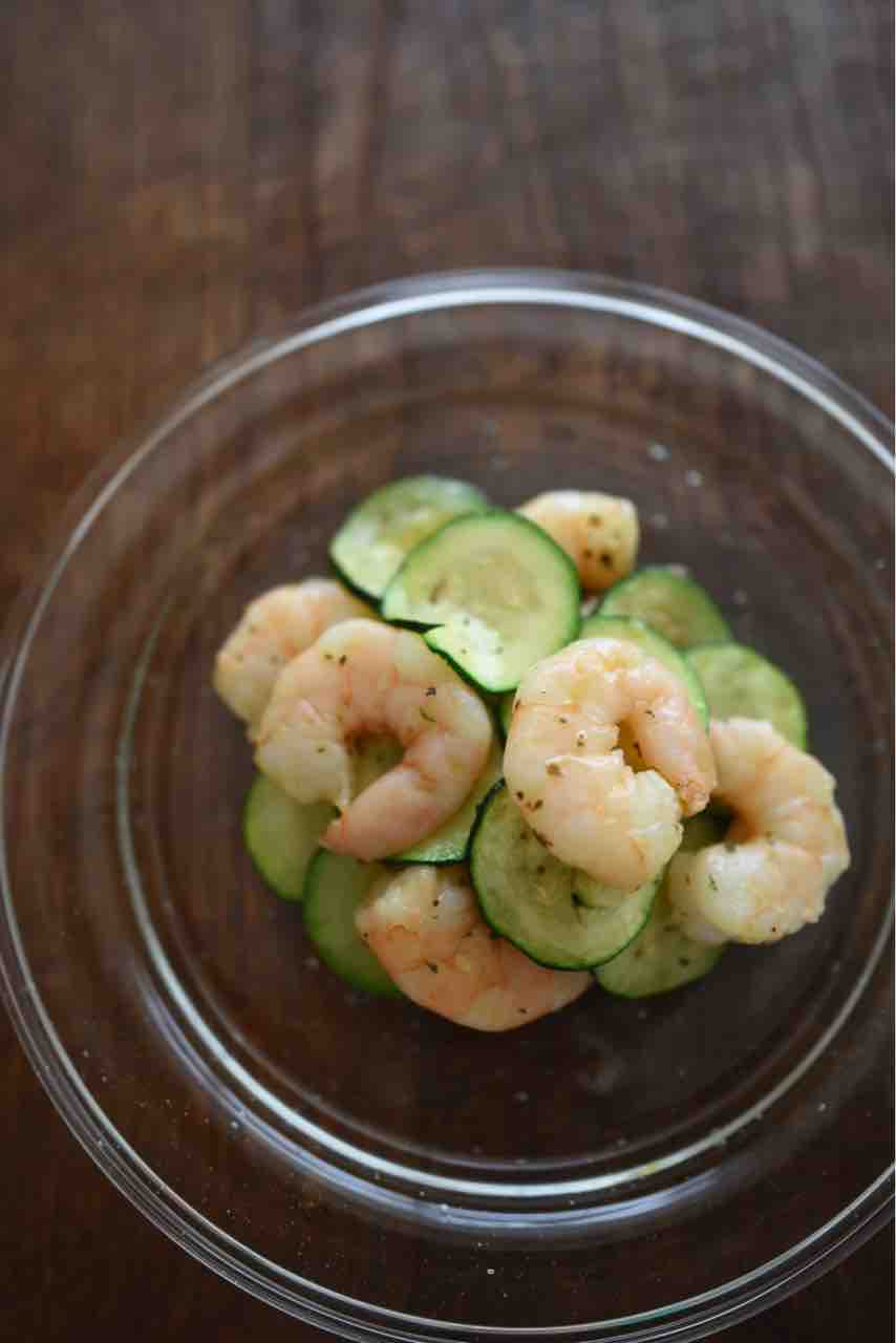 冷凍のブラックタイガーは57℃20分真空低温調理し、炒めたズッキーニと合わせてオレガノでマリネしました。