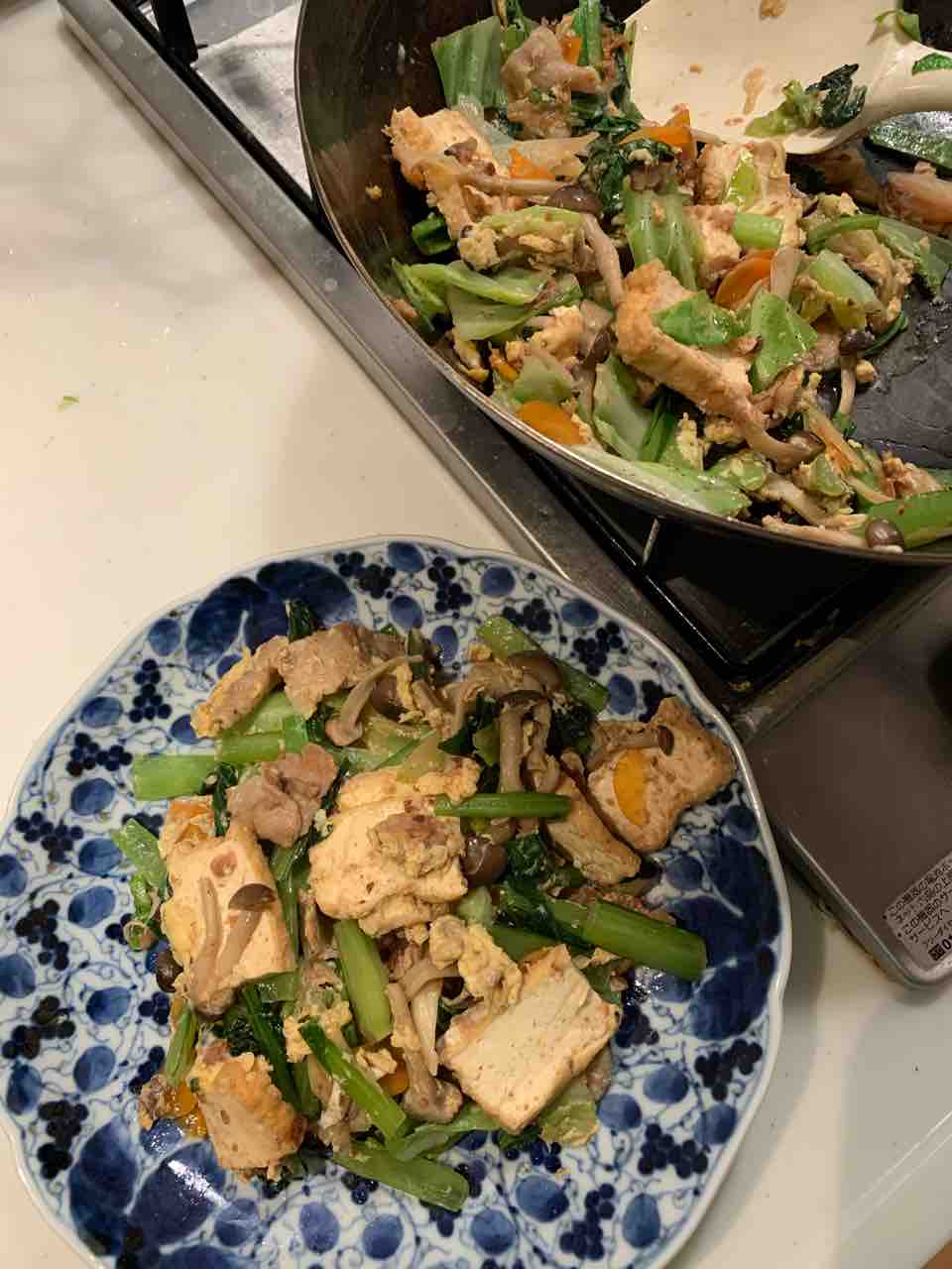 チンゲン菜、厚揚げ、人参、ぶなしめじ、豚バラ肉、キャベツ、長葱 でチャンプルーも作りました。これは息子が包丁してくれました。