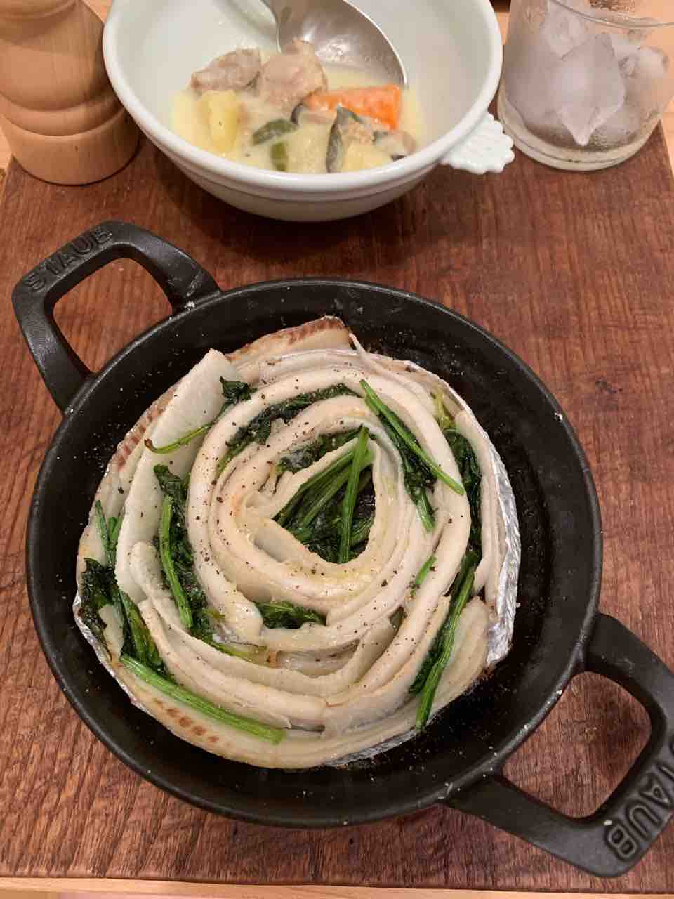 お友達が釣ってきた太刀魚をもらったので、3枚卸しにして長芋、ほうれん草とロール巻きにしてオーブンで焼きました。ほうれん草はあらかじめバター炒めにして挟み込みました。長芋は桂剥きにしました。すごくおいしかったです。