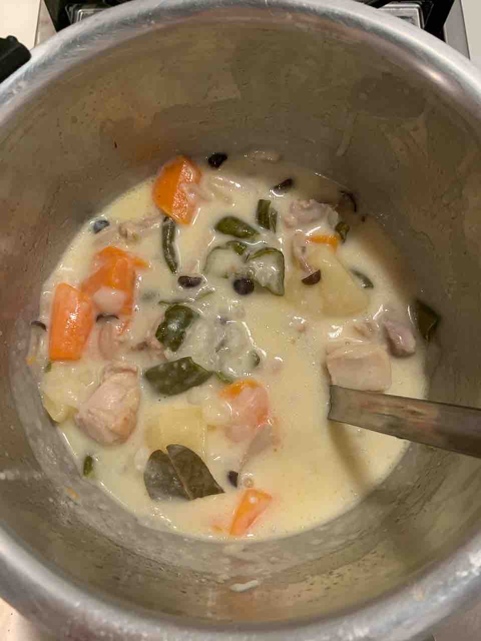 玉ねぎ、にんじん、ぶなしめじ、ピーマン、鶏もも肉 でチキンフリカッセを作りました。これは電気IH圧力なべで自動調理して、最後にホワイトソースだけ人力で作って仕上げました。とっても楽ちんな定番料理です。