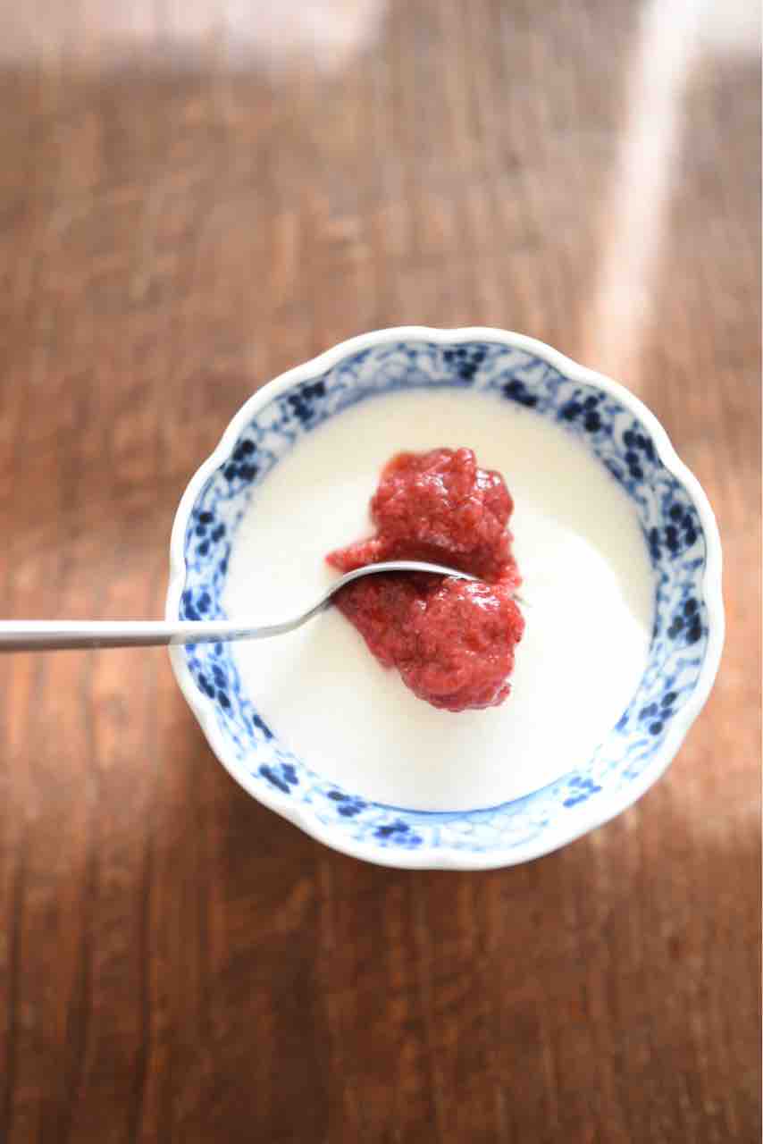低糖質ヨーグルトムースに、少し前作った低糖質いちごソースを解凍してかけて食べました。生クリームもしっかりと入れたこのムースはすごくコクがあって食べ応えがあるのに、のどごしが良いから暑い季節でも食べやすく、夏の定番となりました。