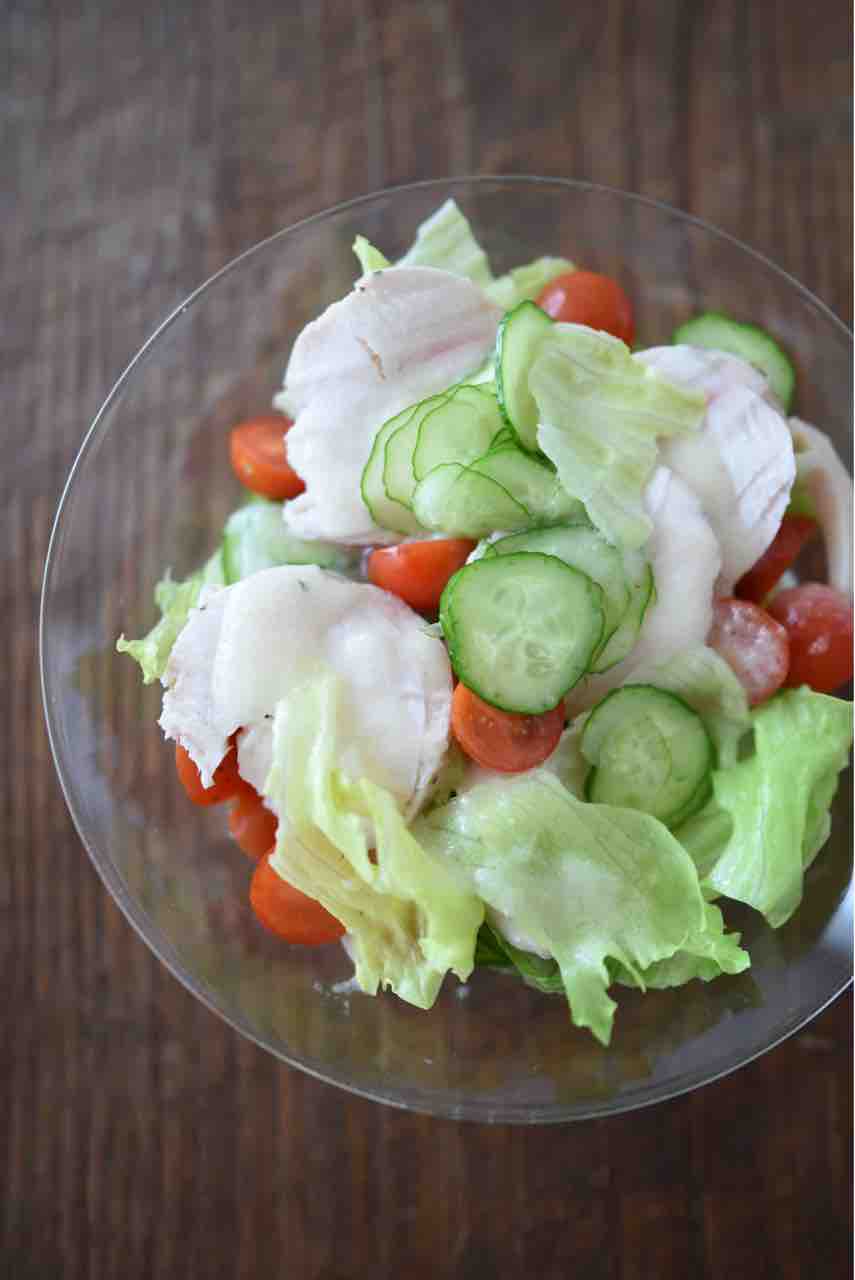 鶏胸肉は低温調理し、レタス、キュウリ、ミニトマト でサラダにしました。