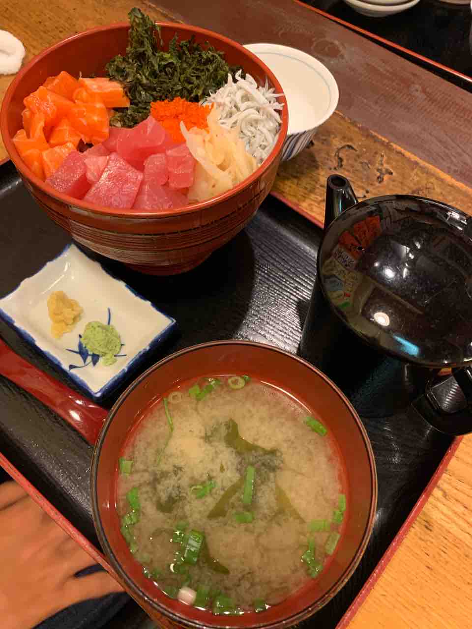 沼津港のそばにある、海鮮丼のお店で、息子が頼んだのは、「まぐろサーモン丼」でした。ご飯は、鯵の炊き込み飯で、湯桶に入った出汁をかければお茶漬けも楽しめるようになっていました。私は、お昼に食べたランチでおなかがいっぱいで何も食べられませんでした。
