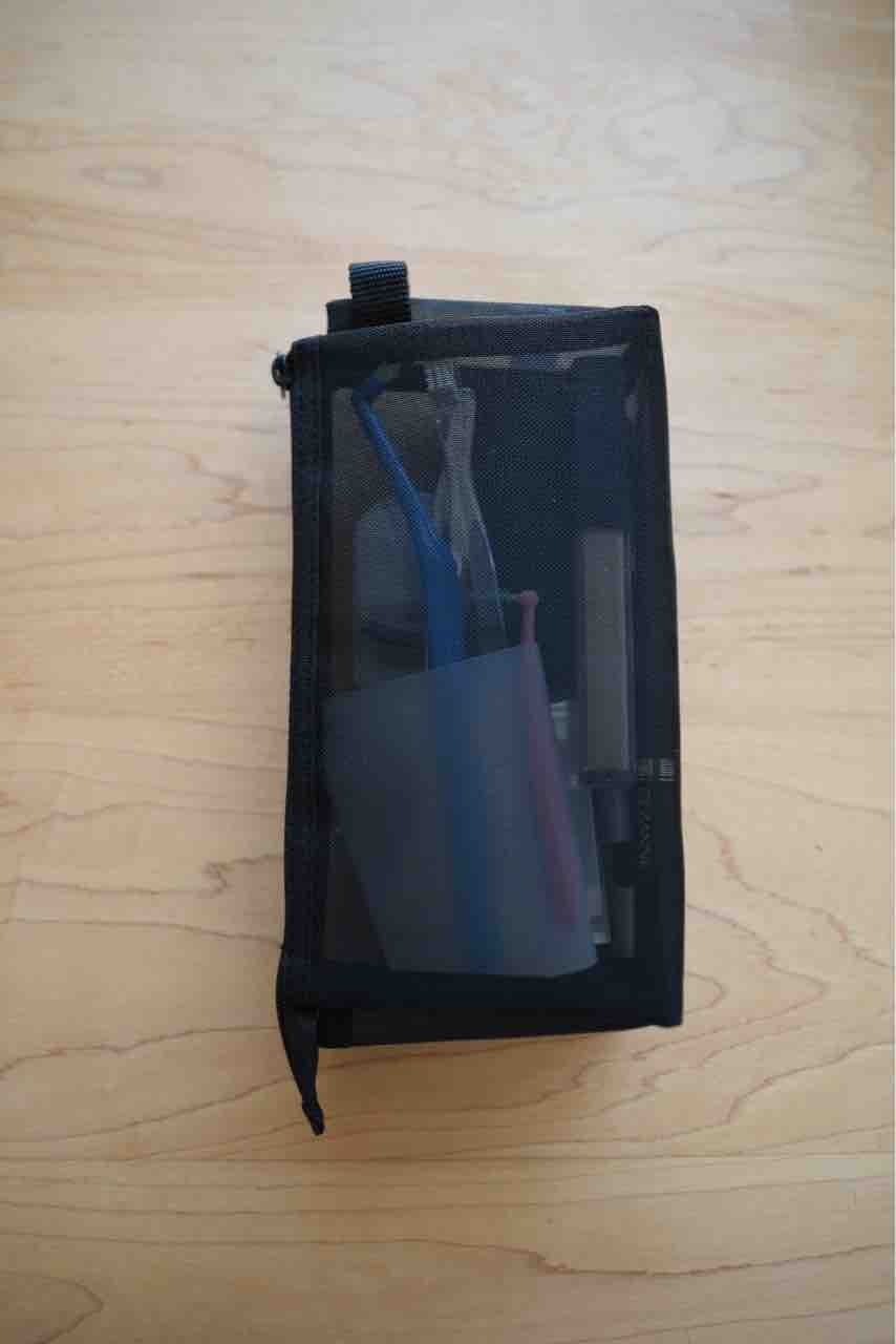 ポーチは無印良品のペンケース・マチ付きというものが1番軽くて使いやすそうだったので採用しました。実際、すごく使いやすいです。