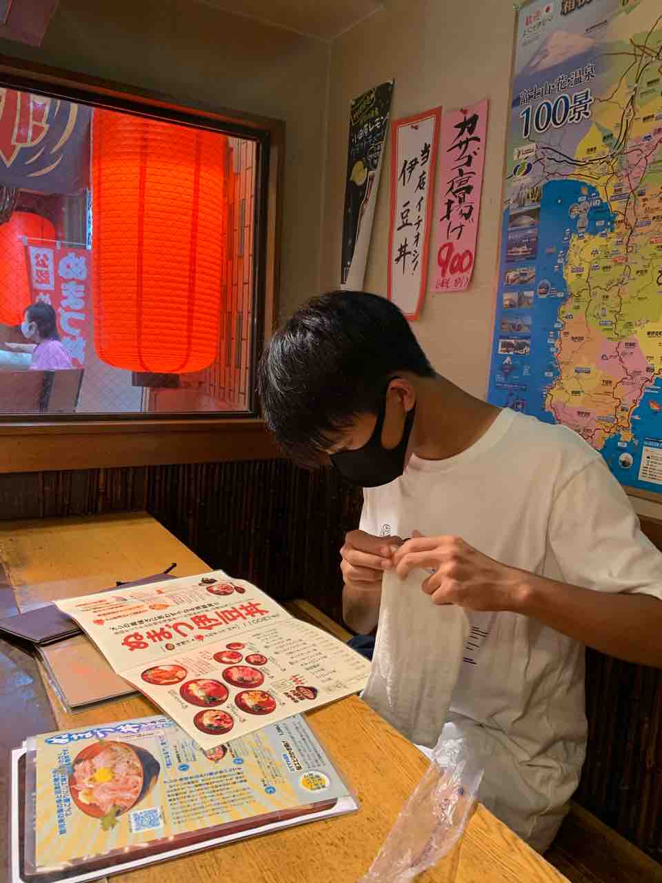 献立をじっくり検討する息子。息子はまぐろサーモン丼がお気に入りでした。