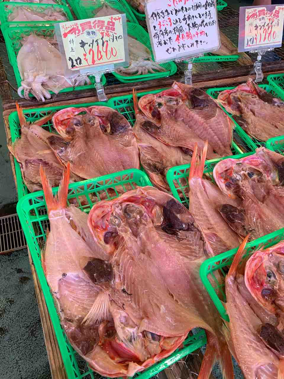 金目鯛、鯛、本鮪、キンキ、太刀魚 など、いつもとは違う干物がたくさん売られていました。