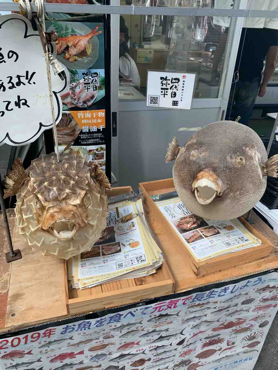 他の店で、ふぐの剥製がたくさん飾られているのを眺めて楽しんだりもしました。