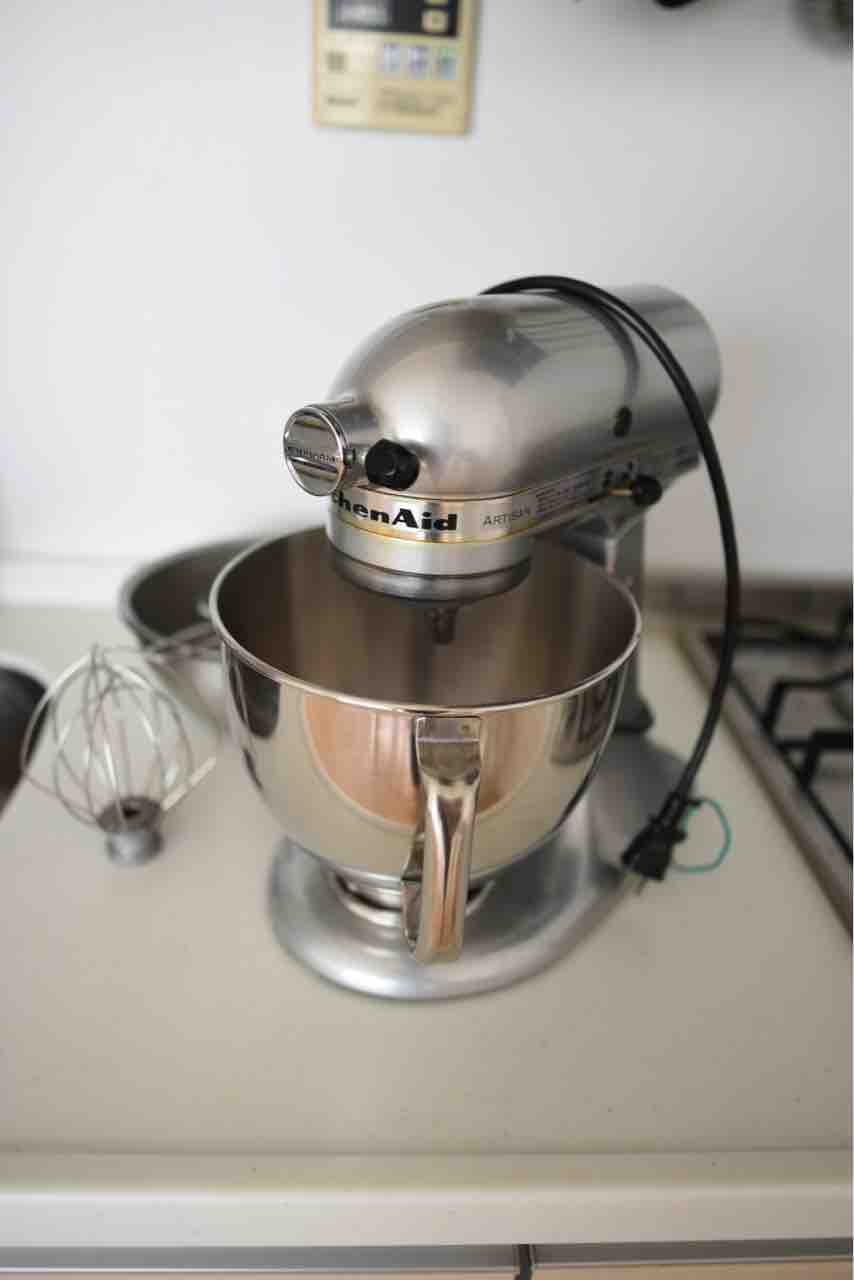 パウンドケーキ生地は、バター、シュガーカットゼロ顆粒、大豆粉、小麦ファイバー、卵、アーモンドパウダーなどを使い、キッチンエイドを使って作りました。キッチンエイドも10年以上使っているので年季が入ってきました。