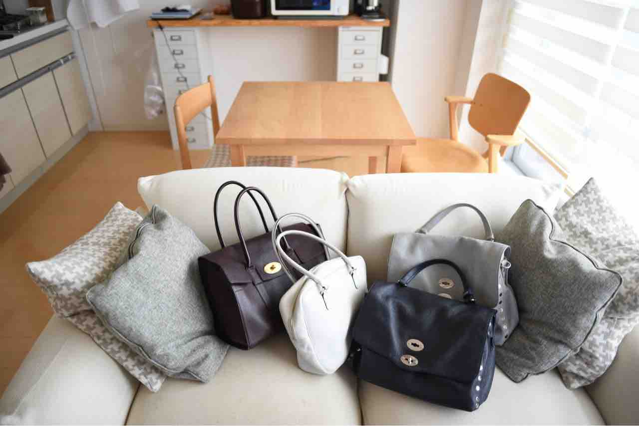 なぜ毎回バッグを変えるかというと、3色コーディネートを実践しているため、洋服に合わせてバッグの色も変える必要があるからです。私のベースカラー3色とはホワイト、ネイビー、ライトグレーであり、このほかに準ベースカラーとしてブラウンを使っています。そのため4色のバッグを使い分けています。(バッグは通常、ウォークインクローゼットに収めていますが、暗いので明るいリビングに持ってきました)