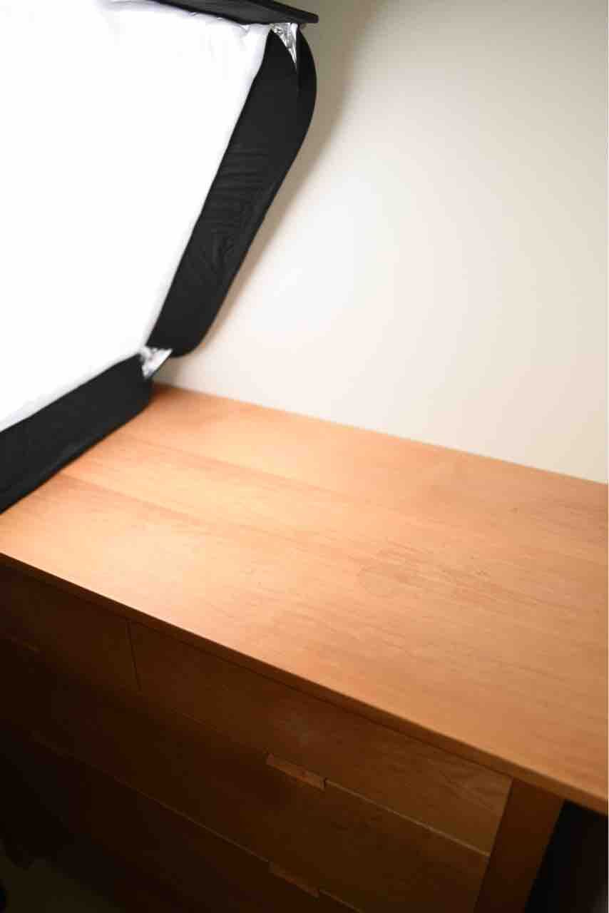 チェストの上を撮影場所にして、左斜め45度にソフトボックスとストロボを固定しておきます。ソフトボックスはライトスタンドに挿してあります。ライトスタンドはチェストの脇に押し込みました。ストロボには他のストロボ光に反応する、スレーブ設定をしておきます。