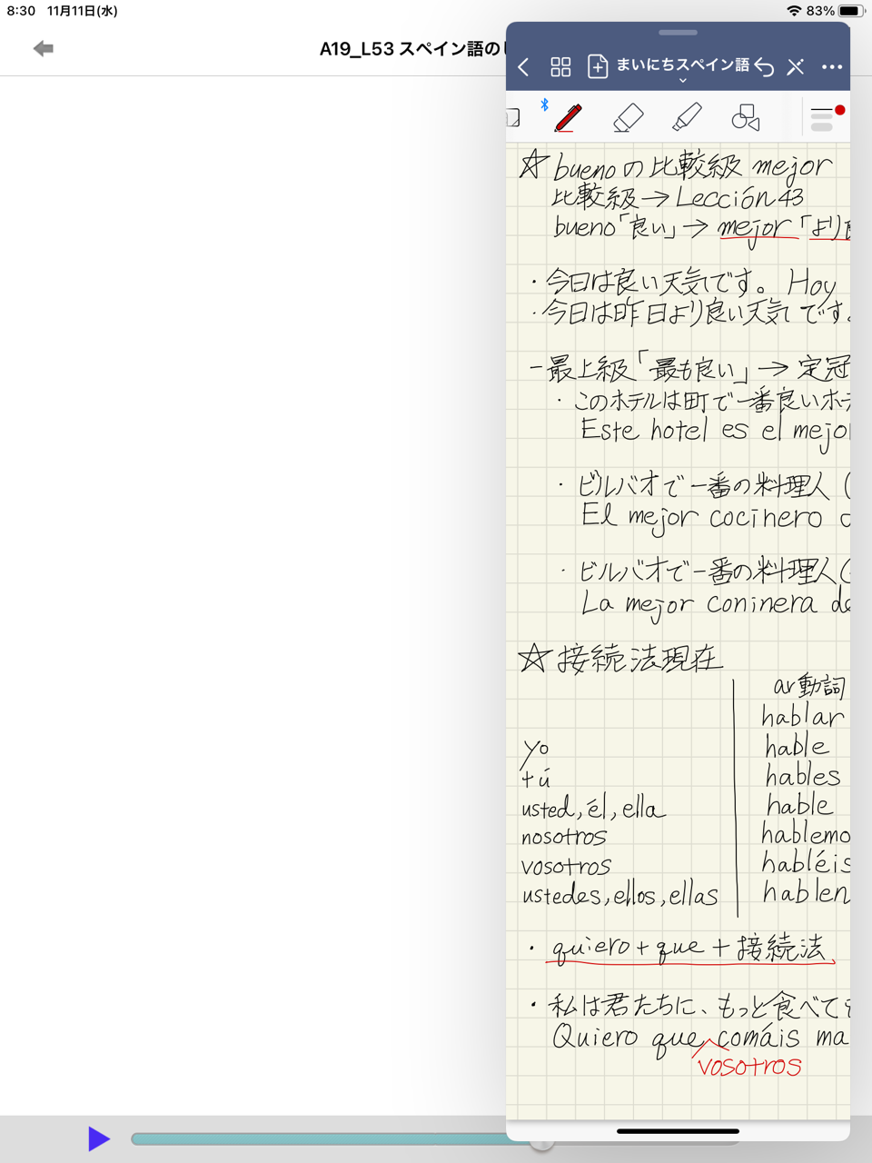 iPadのマルチタスク機能を使い、画面分割してより効率的に語学学習ができるようになりました。例えば、「Split Over」は、主画面の中に小さく副画面を表示することができるのですが、FilePlayerというオーディオブック再生アプリを主画面にして、ノートアプリGoodNotes5を副画面にすれば、ディクテーションや再生したり止めたりしながらのメモがスムーズにできます。