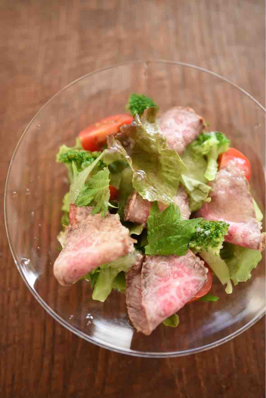 黒毛和牛A5ももブロックは低温調理でローストビーフにしました。サニーレタス、ブロッコリー、大葉、トマト とサラダにしたらこれまたすごくおいしかったです。